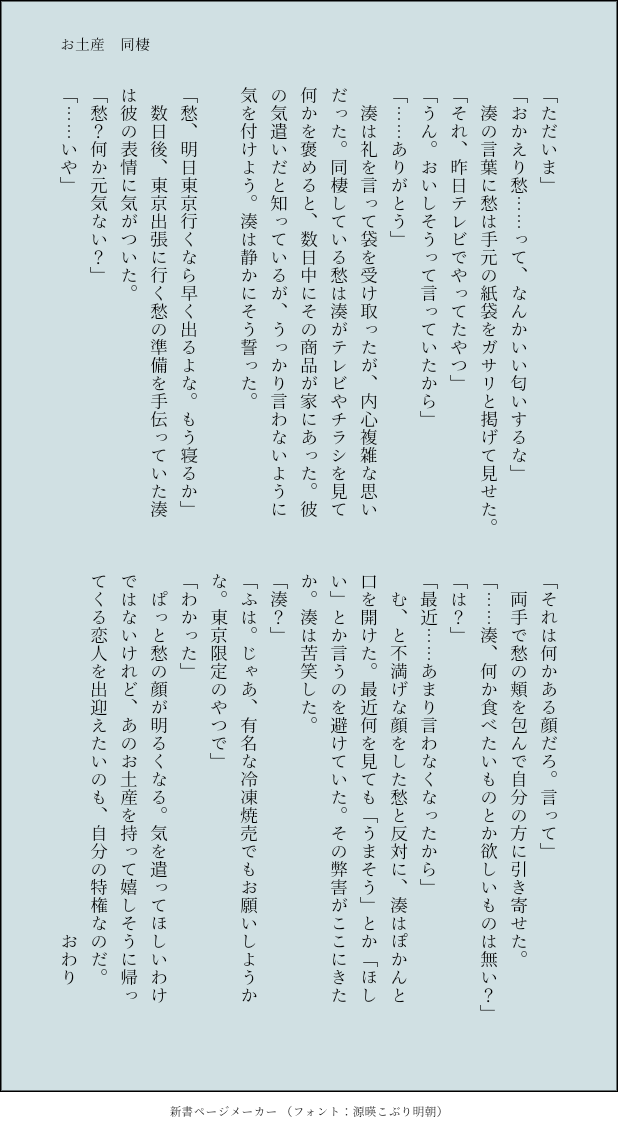 mintfe88☆quiet followMEMO同棲してるしゅ~みなとお土産尽くしちゃう愁くんが好きなんです……6話を受けて、湊くんに逆らえない(?)騎士と貴公子がすごいって改めて思いました。しゅ~みな可愛いね…… Tap to full screen (size:618x1132).Repost is prohibited mintfe88MEMO中2 来客のはなし①②モブが出ます! 2 mintfe88DOODLE高2 ペアルック付き合ってる2人で、お揃いに憧れるしゅうくん 2 mintfe88MEMO中2 小テストを受ける話 4 mintfe88MEMO中二のふたりシャー芯忘れた湊くん百倍返しだ!!!!!! mintfe88MEMO中二のふたり風紀委員になったよ 2 mintfe88MEMO中二のふたり忘れ物した湊くんのために、貴公子動きます