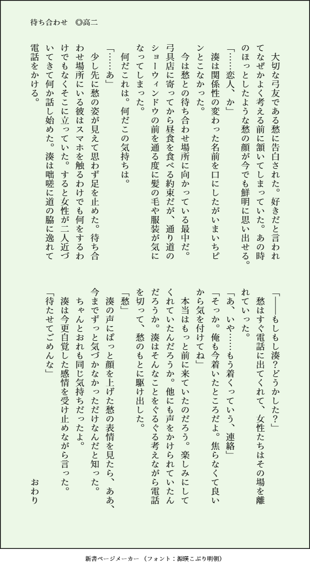 mintfe88☆quiet followMEMO付き合い始めた二人。高二くらい。湊くんの自覚が遅いとかわいい。 Tap to full screen (size:618x1132).Repost is prohibited mintfe88MEMO中2 来客のはなし①②モブが出ます! 2 mintfe88DOODLE高2 ペアルック付き合ってる2人で、お揃いに憧れるしゅうくん 2 mintfe88MEMO中2 小テストを受ける話 4 mintfe88MEMO中二のふたりシャー芯忘れた湊くん百倍返しだ!!!!!! mintfe88MEMO中二のふたり風紀委員になったよ 2 mintfe88MEMO中二のふたり忘れ物した湊くんのために、貴公子動きます