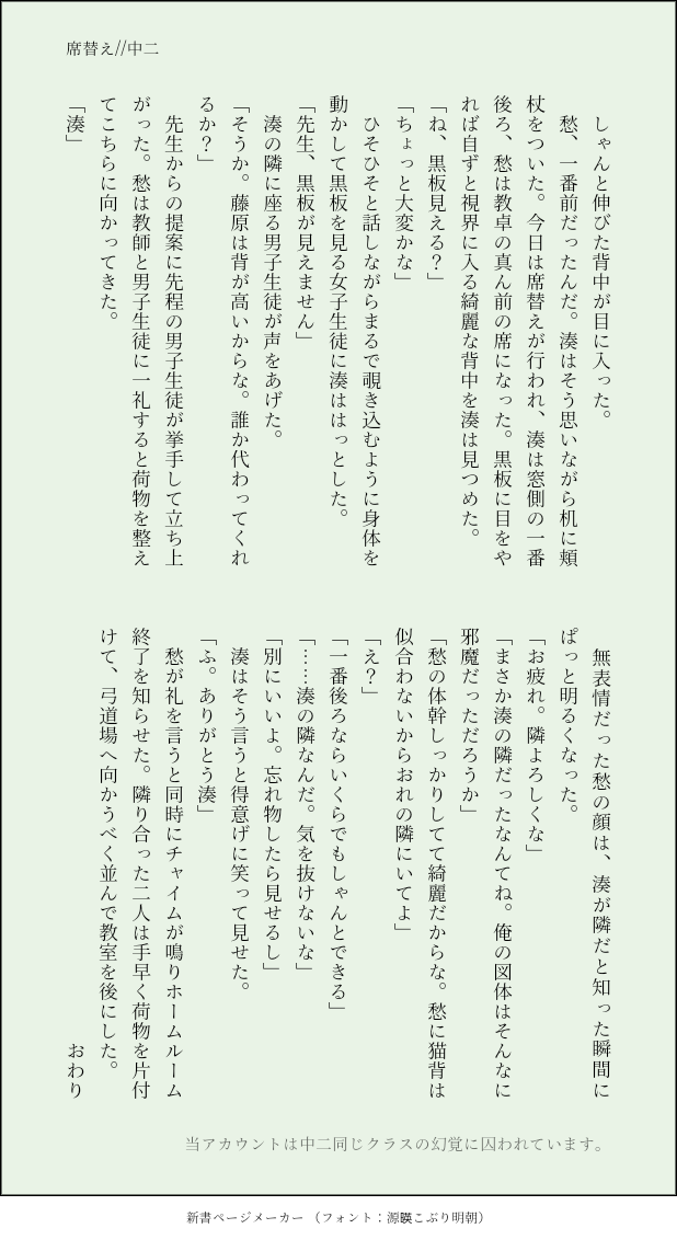 mintfe88☆quiet followMEMO中二のふたり教室広いかもしれない……ほんとに黒板見えないかはわからない…… Tap to full screen (size:618x1132).Repost is prohibited mintfe88MEMO中2 来客のはなし①②モブが出ます! 2 mintfe88DOODLE高2 ペアルック付き合ってる2人で、お揃いに憧れるしゅうくん 2 mintfe88MEMO中2 小テストを受ける話 4 mintfe88MEMO中二のふたりシャー芯忘れた湊くん百倍返しだ!!!!!! mintfe88MEMO中二のふたり風紀委員になったよ 2 mintfe88MEMO中二のふたり忘れ物した湊くんのために、貴公子動きます