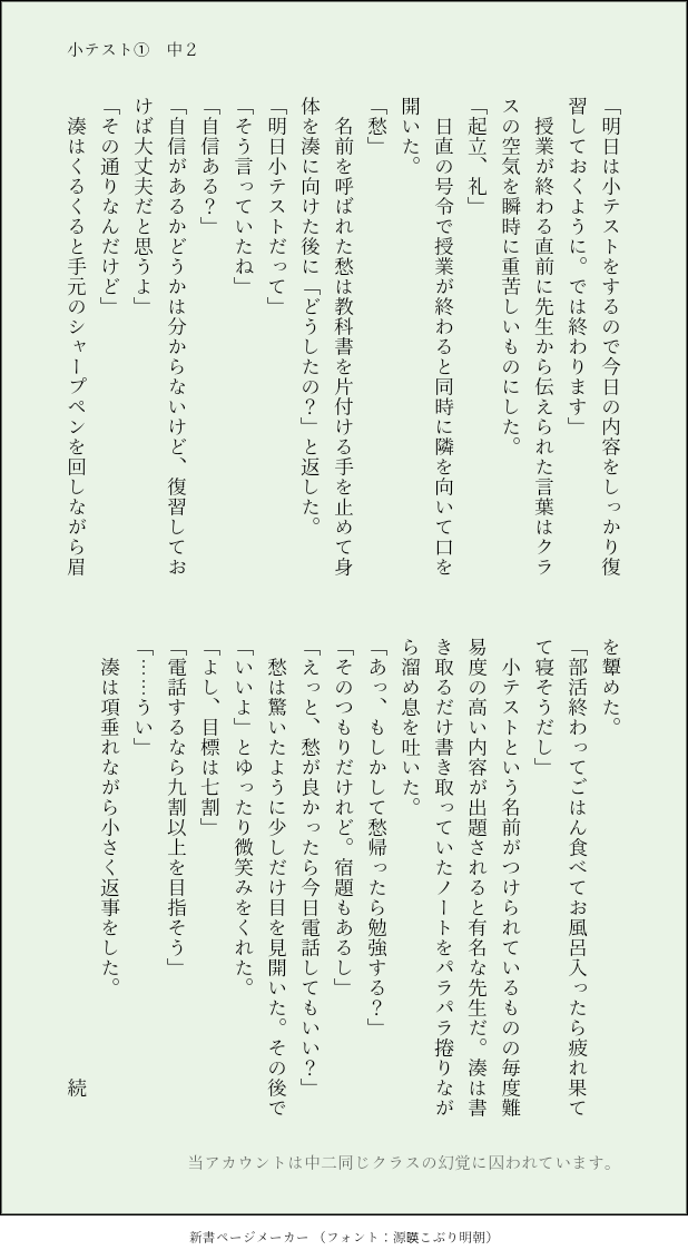 mintfe88☆quiet followMEMO中2 小テストを受ける話 show all(+3 images) Tap to full screen (size:618x1132).Repost is prohibited mintfe88MEMO中2 来客のはなし①②モブが出ます! 2 mintfe88DOODLE高2 ペアルック付き合ってる2人で、お揃いに憧れるしゅうくん 2 mintfe88MEMO中2 小テストを受ける話 4 mintfe88MEMO中二のふたりシャー芯忘れた湊くん百倍返しだ!!!!!! mintfe88MEMO中二のふたり風紀委員になったよ 2 mintfe88MEMO中二のふたり忘れ物した湊くんのために、貴公子動きます