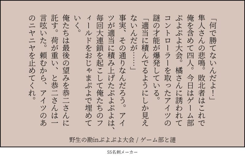 85_yako_p☆quiet followDONEゲーム部と漣 ##ゲーム部 ##牙崎漣 ##カプなし ##140SS Tap to full screen (size:910x590).Repost is prohibited Let's send reactions! freqpopularsnackothersPayment processing Replies from the creator Follow creator you care about!☆quiet follow 85_yako_pDONE「秀の部屋に遊びに来たら百々人の載っている雑誌を集めているのが分かり、ふーんこの子僕のこと好きなのかも🎶って思って聞いてみたら『顔……っ、顔がめちゃくちゃ好みで……‼️』ってほんとに恥ずかしそうなファンの表情で言われてしまって……⁉️」な百々→(←)秀。というお題をあしはらさんから頂いたので、書きました!タイトルもあしはらさんにつけてもらいました。(2025/9/15) 3096 85_yako_pDONEタケルが下心から間接照明を買ってくる話。タケ漣。(2025/8/6) 2932 85_yako_pDONE秀と百々人の会話。韜晦について。(2025/7/7) 3130 85_yako_pDONE百々秀。被虐欲と加虐欲でめちゃくちゃになる百々人の話。攻めの自慰があります。手癖が全開です!解釈より『これが見たい』を優先しています。(2025/06/24) 5224 85_yako_pDONEタケ漣。性行為の描写はないけど性行為前提。ふわっとはあるので注意してください。タケルがちょっと暴力的な感じある。 4573 85_yako_pDONEトレード品です。後日ちゃんとあげます。※絶対にやってはいけないプレイをしています。絶対にやってはいけません。 3719 recommended works あやめ🍌🐟DOODLEタケ漣のようなもの don_moimoiDONEタケ漣チューしてます 5 don_moimoiDONEカイレを目撃してしまったモブの漫画です。二人は目を離したらすぐいちゃいちゃしててそう(偏見)あとカイはいちゃつきをあんまり人見られたくない派かも、レッカはあんまり気にしないけどカイがうるさいからここでは大人しくしてます。+ボツの絵とかすこしレッカの服ってどうなってんの? 8 udnkPAST2020年2月に出したタケルくんが派生の漣くんを全員抱くめちゃくちゃなタケ漣本です。しばらく再公開しておきます 16 ey_hi_ozzINFO10/7-8タケ漣Webオンリー新刊【無知のヨユー】A5/26P/R18/400円 6 sakura0610hyskDOODLEタケ漣の漣 jk_father_papaDOODLE鷹鰐🦅🐊催眠を受けた🐊y/n 4 chiocioya18DONE夏のタケ漣。アイスと花火。推しカプいちゃいちゃしろの妄念です。 1010 槥眠⚰えいみんDONE※若干夢絵です※正装バストアップ公開記念絵