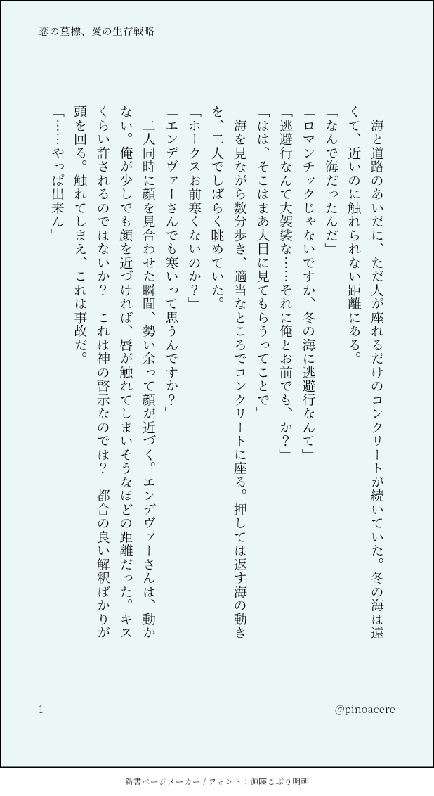 pinoacere☆こそフォロできたホー炎「恋の墓標、愛の生存戦略」※最終回以降離婚してなくて不貞でもないけどホー炎です。今のわたしの中にいる二人を書きました。わたしのホー炎の、現状の着地地点です。2026.01.23 すべて表示(+6枚) タップで全画面(原寸:618x1132)無断転載禁止 リアクションをたくさん送って応援しよう! よく使う人気おやつその他支払処理中 作者からのリプライ 気になる人をどんどんフォローしよう!☆こそフォロ pinoacereできたホー炎「恋の墓標、愛の生存戦略」※最終回以降離婚してなくて不貞でもないけどホー炎です。今のわたしの中にいる二人を書きました。わたしのホー炎の、現状の着地地点です。2026.01.23 7 pinoacereできたホー炎「永遠を誓う」※8年後以降2025.12.11 8 pinoacereできたホー炎「さようならとこんにちは」※8年後以降2025.11.03 5 pinoacereできたホー炎「疲れた夜には甘いもの」※8年後以降2025.10.31 4 pinoacereできたホー炎「bittersweet」※8年後以降2025.10.28 4 pinoacereできたホー炎「別にファンではありませんけど?」※原作軸謎時空、なむこ描き下ろしの小話2025.10.25 6 おすすめ作品 wa11540263らくがき🐣🌙姫だっこおまけもあるよ 6 goldbtmumaiらくがき Sheep_lordらくがきNess bắt cóc và rape Isagi (18?) yes/no 2 ERUMO_3Nらくがき DANA作業進捗5/3kiis新刊予定進捗上半身が裸なだけですが、本文が18禁のためワンクッション 2 ハラミらくがきぱーてぃーしーえー! 110n04らくがき拗ねらせたhmのhm→ts______※hmrがtskへの片想いを拗ねらせている話です※雰囲気はちょい暗めですが、tskがどう感じているかはご想像にお任せします※例の如く何でもいい方向け 2734 naniらくがき熊明 3 能勢ナツキメモ絲遣い単巻1〜6巻の表紙絵をネットプリントシール用作ってみましたL判シール用で作ってありますがお好きなサイズで印刷していただいても大丈夫です登録番号は画像2枚目、店舗検索は下記URLからどうぞhttps://networkprint.ne.jp/sharp_netprint/ja/top.aspxシールが好きでたま〜に作るんですけど、その度に「でも使い道ないな…」って思います笑 4