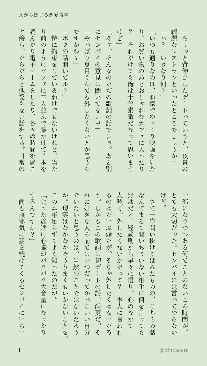 pinoacere☆quiet followDONE「Aから始まる恋愛哲学」(夏つむ)※ズ!!時間軸 / AtoZ後の話。2020.05.06 show all(+8 images) Tap to full screen (size:1236x2184).Repost is prohibited Let's send reactions! freqpopularsnackothersPayment processing Replies from the creator Follow creator you care about!☆quiet follow pinoacereDONEホー炎「せかいでいちばん」8年後、両想いだけどまだ両片想いっぽさが残る2人のちょっとした小話。2025.09.25 7 pinoacereDONE(ホー炎)「モブ子の憂鬱」🍫のSS真夏に突然のチョコの広告!私にチョコを一粒差し出してくる推し!私たちの情緒はどうなる⁉※モブ子たちが喋っているだけの本当にただの落書き?です。※みんな現役の謎時空です。※後半少しだけホとみるこさんが出てきます。2025.07.14 7 pinoacereDONE(ホー炎)「優しいスープの作り方 2」※~8年後に至るまで、離婚済みだけど同居してる炎司と冷。炎司を口説き落とすため毎日通い詰めるホ。※轟家全員ホに協力的です。ホー炎しか出てきません。※願望としての軽いカニバ表現がでてきます。前回の続きです🐥2025.07.05 16 pinoacereDONE(ホー炎)「可愛いだけじゃダメですか?」鷹えんのノベルティコピー本でした。お手に取って下さった方々、本当にありがとうございました!10代ホの写真から始まる、8年後軸ホー炎の小話です。ホー炎いつまでも軽口叩きあってほし〜!という気持ちで書きました。とても楽しかったです! 10 pinoacereDONE「優しいスープの作り方」(ホー炎)※原作軸~8年後に至るまでのどこかえんじとれいは同居していて、そこにえんじを口説き落とすために毎日通っているホとそれを応援するれいっていう謎のかんじです。ホとれいさんが仲良しです。とどろきけ大好き人間が書いています。2025.06.05 7 pinoacereDONE「カフェ店員の鷹見くんと部長の轟さん」(ホー炎)※個性なし現パロ🐥☕2025.05.26 6 recommended works 夜のお茶会DOODLEガブサリらくがきまとめ duckspring__DOODLE가내 사도의 낙서가 쌓여서 방출 . . . (바니걸/약한노출 포함)비번: y 3 アココチャンDOODLE逆サンタ🎅 もノてりゃDONE性癖パネルトラップ高画質画像+コメントになります。リプ・メッセ頂いた皆様ありがとうございました! 9 sioduke_sabaDOODLE快刀乱魔げんみ❌ HO3の秘匿もらってる人🙆♀️1陣ほさん落書き 3 みずたわにPASTドット絵もどき。この頃やたらと1ドットペンがお気に入りで、ドット絵風を量産してました。 Tuyutuki_subDONE加工でこれがこうじゃ 2 ldouzisamaDOODLE丸人間2024年2月1日~6月30日までのログです 150 beadriberDOODLEヒデってマヨさんイジるんだぁ…めっちゃ味する…