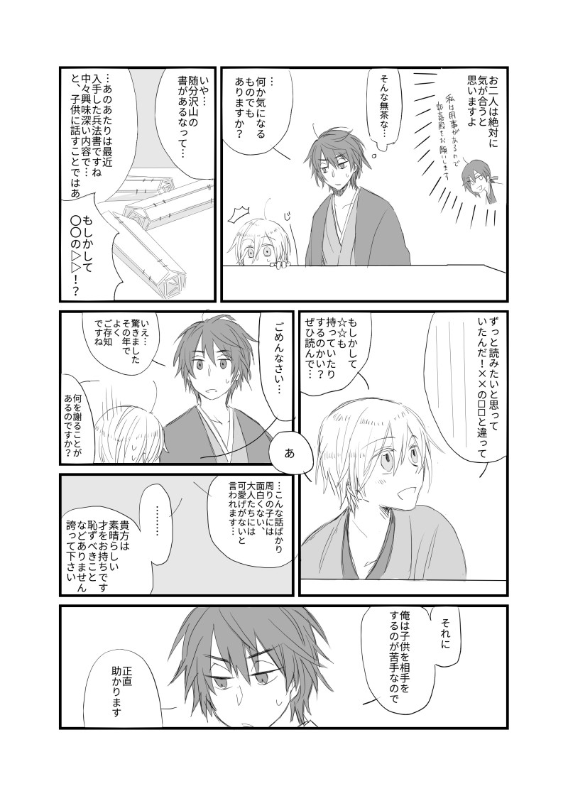 shimasima_shiro☆quiet followMAIKING2ページ目以降描く前に力尽きたやつちっさい郭嘉と荀攸が軽率に出会ってほしい Tap to full screen (size:2122x2976).Repost is prohibited Let's send reactions! freqpopularsnackothersPayment processing Replies from the creator Follow creator you care about!☆quiet follow shimasima_shiroSPOILER※士伝ネタバレは無いけどキャプションににおわせがある※※SF(少し不思議)してるのでノリと勢いだけで読んでほしい※士伝観る前はながそねさんが振り返らなくていいようにそっと背中を押してくれるきよまろってイメージだったんだけど、士伝観た後はながそねさんに前を向けって真正面からひっぱってくれるきよまろというのもアリなんだ…(?)みたいな気持ちになって描いた漫画 2 shimasima_shiroSPOILER※士伝思いっきりネタバレめちゃくちゃ下書きなんだけど、初見の衝撃を残しときたいなって描いたでも一回しか見てないので大嘘描いてるかもしれない【追記】大嘘では無かったけど幻聴だったセリフはありましたごめんなさい 2 shimasima_shiroDOODLE※めちゃくちゃがっつりそねまろ※しょやの話だけど致すところまで辿り着いてはいないけどめちゃくちゃ露骨な話はしてる(頭2枚の絵は無関係だけどそねまろなので一緒に上げた)※二振ともキャラ崩壊ぎみ特にきよまろ※まじで何見ても大丈夫な人だけ「きよまろの番号ーながそねさん(極)の番号」で見てやってください 7 shimasima_shiroSPOILER※坂龍ネタバレありミュをちゃんと追えてないのでこれは完全に妄言かもしれないけど、辛い記憶を自分の手で繰り返しながら平気な顔して笑うむっちゃんと、天狼傳で近藤さんを斬ろうとしたながそねさんに同じしんどみを感じたんですよね…という漫画それが無くても似たもの同士なところがある二振だと思ってるので、多分自分も同じことするだろうな…と思うことは…あるんじゃないですかね…どうなんですかね… shimasima_shiroDOODLE※ラストマイルネタバレいや私もまさか絵まで描くことになるとは思わなかったよ。しかもここの人たちを描くとは思わなかったよ。でもめちゃくちゃ良かったんだよ〜〜〜娘さんたちがうろ覚えで申し訳ない… shimasima_shiroSPOILER※大慶内番服ネタバレ似たもの師弟いっぱいあびたい…