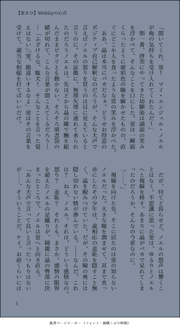 na_no_ka_tw☆quiet followDONE小説:【蛍まひ蛍】Middayの心音晶くんとノエルくんが付き合いだした世界線の蛍くんとまひるくんの話。誰が悪いわけでもない、ただ当たり前にある感情。(2019.11.10) show all(+7 images) Tap to full screen (size:618x1132).Repost is prohibited Let's send reactions! freqpopularsnackothersPayment processing Replies from the creator Follow creator you care about!☆quiet follow na_no_ka_twDONE小説:【晶蛍】心星(#星空の下のふたり)9章2周年記念。(2022.3.10) 1869 na_no_ka_twMOURNING晶くんの誕生日ボイスを聞いて書こうとしたやつ。序盤も序盤で投げてしまった。晶くんとメリパの会話だけ。本当は全員大集合~~~ッッッ!!!がやりたかったんだろう(完) na_no_ka_twDOODLE紫藤晶くん誕生日おめでと~~~~~~~~~~~~~~~~~~~~~~~!!!!(20210217) na_no_ka_twDONE小説:【やる気VS無気力(光国と蓮太郎)】深夜に二人でワルイコト蓮太郎くんと光国くんが深夜にカップ焼きそばを食べるはなし。2020年の書き納め(2020.12.31) 7 na_no_ka_twDOODLEもちあきらくんを救うとこまでいかなかった na_no_ka_twMOURNING小説:【晶蛍】影宮蛍の結婚蛍くんの結婚式の友人挨拶を頼まれたノエルくんのはなし。ちょっぴり自分のなかで消化不良なので供養で失礼。(2020.11.02) 4 recommended works 小鉢の絵置き場DOODLEショコラスーツ 小鉢の絵置き場DOODLEア二メ◯ト特典CDやばかったねの幻覚 小鉢の絵置き場REHABILI「これには事情が……って ちょっとっ 晶!?」 小鉢の絵置き場REHABILIおはよう、蛍! 空夢(あけむ)DOODLE⚠️一応女装注意⚠️メイドの日のあきけ〜イチャイチャが見たかった(願望) 空夢(あけむ)PASTハロウィンのあきけ〜最高〜〜だけど作画コスト高すぎてそんなに量産出来ないのがつらみ。(制服でさえ描くのめんdだと思ってしまう程身体描くの苦手なので) 空夢(あけむ)PAST吸血鬼と祓魔師あきけ〜最高〜〜〜って仕事あるのにクソ夜更かしして描いたあまりにも汚い落描き。(厨二病乙です!)もっとちゃんと描きたかったなぁ…😅 空夢(あけむ)TRAININGCP絵普段描かねえので描けねえ…………練習しょ。。。 小鉢の絵置き場DOODLEワンドロ お題『眩しい』クリスタの素材、ソーラーパネルの3Dモデルまであるのさすがに草