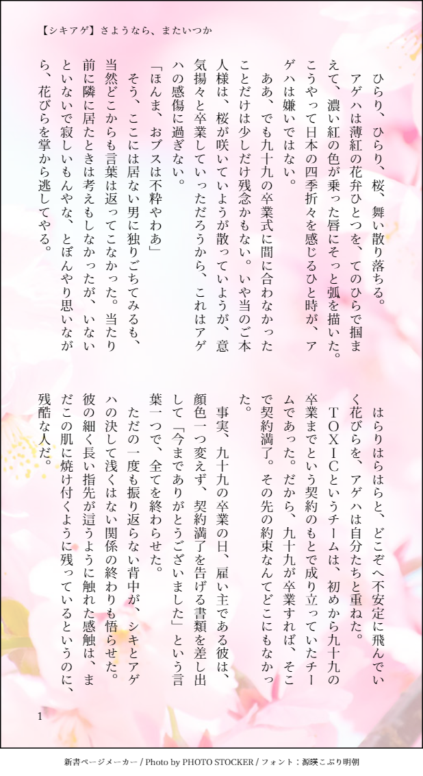 na_no_ka_tw☆quiet followDONE小説:【シキアゲ】さようなら、またいつかリプもらった番号のワードを使って文を書く13.プセマ(叩く/大人/地面)(2019.11.16) show all(+4 images) Tap to full screen (size:618x1132).Repost is prohibited Let's send reactions! freqpopularsnackothersPayment processing Replies from the creator Follow creator you care about!☆quiet follow na_no_ka_twDONE小説:【晶蛍】心星(#星空の下のふたり)9章2周年記念。(2022.3.10) 1869 na_no_ka_twMOURNING晶くんの誕生日ボイスを聞いて書こうとしたやつ。序盤も序盤で投げてしまった。晶くんとメリパの会話だけ。本当は全員大集合~~~ッッッ!!!がやりたかったんだろう(完) na_no_ka_twDOODLE紫藤晶くん誕生日おめでと~~~~~~~~~~~~~~~~~~~~~~~!!!!(20210217) na_no_ka_twDONE小説:【やる気VS無気力(光国と蓮太郎)】深夜に二人でワルイコト蓮太郎くんと光国くんが深夜にカップ焼きそばを食べるはなし。2020年の書き納め(2020.12.31) 7 na_no_ka_twDOODLEもちあきらくんを救うとこまでいかなかった na_no_ka_twMOURNING小説:【晶蛍】影宮蛍の結婚蛍くんの結婚式の友人挨拶を頼まれたノエルくんのはなし。ちょっぴり自分のなかで消化不良なので供養で失礼。(2020.11.02) 4 recommended works 小鉢の絵置き場DOODLEあきけーねこみみまんが(IQ3) 2 小鉢の絵置き場DOODLEショコラスーツ 小鉢の絵置き場DONE9章配信直前描いた絵君に影を落とす/晶蛍 小鉢の絵置き場REHABILI顔の近い騎士様 小鉢の絵置き場REHABILIおはよう、蛍! 空夢(あけむ)DOODLE⚠️一応女装注意⚠️メイドの日のあきけ〜イチャイチャが見たかった(願望) 空夢(あけむ)PASTハロウィンのあきけ〜最高〜〜だけど作画コスト高すぎてそんなに量産出来ないのがつらみ。(制服でさえ描くのめんdだと思ってしまう程身体描くの苦手なので) 空夢(あけむ)PAST例のローディング中にでてくる画像のあのセリフ。あきけ〜だけお互いの名前出してるの本当に強すぎて適わねえよ…末永くお幸せに……👋🏻💒 空夢(あけむ)TRAININGCP絵普段描かねえので描けねえ…………練習しょ。。。