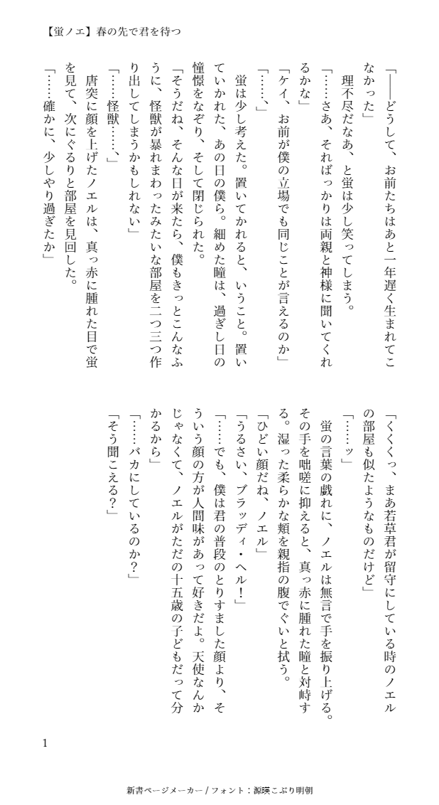 na_no_ka_tw☆quiet followMOURNING「春の先で君を待つ」の別ルート。 Tap to full screen (size:618x1132).Repost is prohibited Let's send reactions! freqpopularsnackothersPayment processing Replies from the creator Follow creator you care about!☆quiet follow na_no_ka_twDONE小説:【晶蛍】心星(#星空の下のふたり)9章2周年記念。(2022.3.10) 1869 na_no_ka_twMOURNING晶くんの誕生日ボイスを聞いて書こうとしたやつ。序盤も序盤で投げてしまった。晶くんとメリパの会話だけ。本当は全員大集合~~~ッッッ!!!がやりたかったんだろう(完) na_no_ka_twDOODLE紫藤晶くん誕生日おめでと~~~~~~~~~~~~~~~~~~~~~~~!!!!(20210217) na_no_ka_twDONE小説:【やる気VS無気力(光国と蓮太郎)】深夜に二人でワルイコト蓮太郎くんと光国くんが深夜にカップ焼きそばを食べるはなし。2020年の書き納め(2020.12.31) 7 na_no_ka_twDOODLEもちあきらくんを救うとこまでいかなかった na_no_ka_twMOURNING小説:【晶蛍】影宮蛍の結婚蛍くんの結婚式の友人挨拶を頼まれたノエルくんのはなし。ちょっぴり自分のなかで消化不良なので供養で失礼。(2020.11.02) 4