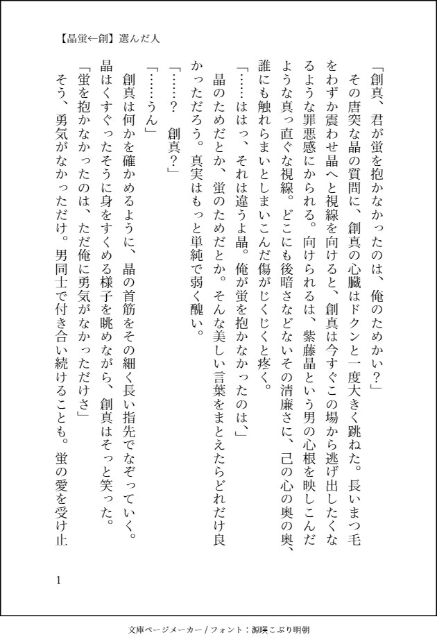 na_no_ka_tw☆quiet followDONE小説:【晶蛍←創】選んだ人創真くんの独白みたいなの。(2020.07.18) show all(+1 images) Tap to full screen (size:630x928).Repost is prohibited Let's send reactions! freqpopularsnackothersPayment processing Replies from the creator Follow creator you care about!☆quiet follow na_no_ka_twDONE小説:【晶蛍】心星(#星空の下のふたり)9章2周年記念。(2022.3.10) 1869 na_no_ka_twMOURNING晶くんの誕生日ボイスを聞いて書こうとしたやつ。序盤も序盤で投げてしまった。晶くんとメリパの会話だけ。本当は全員大集合~~~ッッッ!!!がやりたかったんだろう(完) na_no_ka_twDOODLE紫藤晶くん誕生日おめでと~~~~~~~~~~~~~~~~~~~~~~~!!!!(20210217) na_no_ka_twDONE小説:【やる気VS無気力(光国と蓮太郎)】深夜に二人でワルイコト蓮太郎くんと光国くんが深夜にカップ焼きそばを食べるはなし。2020年の書き納め(2020.12.31) 7 na_no_ka_twDOODLEもちあきらくんを救うとこまでいかなかった na_no_ka_twMOURNING小説:【晶蛍】影宮蛍の結婚蛍くんの結婚式の友人挨拶を頼まれたノエルくんのはなし。ちょっぴり自分のなかで消化不良なので供養で失礼。(2020.11.02) 4