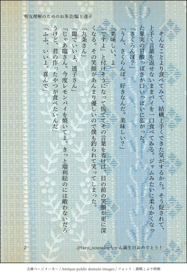 oishi_mattya☆quiet followDONEうちうちちゃんまとめ臨と透子/三浦兄弟/クロ→はる/こうひろ #うちうち familyCircle show all(+6 images) Tap to full screen (size:630x928).Repost is prohibited Let's send reactions! freqpopularsnackothersPayment processing Replies from the creator Follow creator you care about!☆quiet follow oishi_mattyaSPOILERXからの告白 ネタバレ(3陣⭕️) oishi_mattyaDOODLEタイトル通り 8割くらいユーリさんが自分でしてるだけです 1560 oishi_mattyaDOODLE正イデネタバレ 不定中の弊ほよんの話 1774 oishi_mattyaPAST過去作まとめ うちよそ/うちうち/よそよそごっちゃ 39 oishi_mattyaDONE*にんじんネタバレにんじんほよんさんのファンアート 2 oishi_mattyaDONE一応EFネタバレ 同棲時空のはるたけはる緩い最中はむお誕生日おめでとう!!!!(遅刻) 2 related works oishi_mattyaDONEEF未通過❌ シナリオ後の箕田科晴也と溝口ルカの話メンタルにくるかもなので元気なときに読んでください。作者はぼろぼろです 2365 oishi_mattyaMOURNING幸司君と光理ちゃんゆりかご電車の後あたり「中屋敷君って、頭の中ぶっ飛んでるのに、案外人を放っておけないタイプだよねー」 仲良しの刑事さん――唯崎姐さん――は俺にお茶を差し出して、疲れた顔で笑った。「え~、そうですか? 俺はまっとうな大学生男子ですよ~!」「いや、まっとうな大学生男子は心霊写真撮りに来て、不良と絡んで、警察に捕まったりしないから」 まったく……。と溜め息を吐く唯崎姐さんにまあまあと言って、貰ったお茶を飲む。口の中を切ったからしみて痛い。「い……っ! ……でも、ほっとけないじゃないですか。アイツら祠壊して遊んでたんですよ? 怪奇現象に対する冒涜です。……それに、後からあの人達に天罰とかあっても怖いし」 唯崎姐さん知ってます? 怪奇現象って魅力的ですけど、遊び半分で首突っ込むと怖い目に遭うんですよ。だから、ちゃんと敬意を持って接しなきゃいけないし、首をつっ込むならそれ相応の覚悟を持ってやらないと。 一息にそんなことを言うと、唯崎姐さんは目を真ん丸にして、「へぇ」と呟いた。「いつも遊んでるだけかなーって思ってたよ。結構真面目なこと考えてたんだ」「うーん、最初は遊び半分だったんですけど、一回痛い目見た 981 oishi_mattyaREHABILI久しぶりに三人称を書きたくなった&新しい書き方にチャレンジした産物薄墨史郎のお話「大丈夫」という言葉 目が覚めたときに、彼の視界に海が広がっていた。と言ってもそれは一種の形容的言葉でしかない。というのも、彼――薄墨史郎の病に侵された目には彼の又甥であり彼の弟子である青年の青い髪が海のように鮮やかに見えたというだけなのだから。 師匠、と呼ぶ青年の声はかすれていた。髪よりも淡く、煌めくような蒼の目は憔悴しきっており、史郎がその中にひび割れた硝子の破片があるようにすら思ってしまった。 藍、と青年を呼ぶ史郎の声は、青年の声以上にやつれ細くなっていた。その短い言葉を吐くだけで眩暈が起きるほど、史郎は衰えていた。名を呼ばれた青年は――薄墨藍は微かに肩を震わせて、それから史郎の病み衰えた手に触れた。 怖がってはいけないよ。私は十分生きたのだから。もう少し、あと少しと思うほど生きてきたのだから。 1768 oishi_mattyaMOURNINGこうひろこう 18歳幸司君と19歳広記君の話 2 たっくMEMO元企画っ子ツヴァイ(左)一人称:俺二人称:お前、あんた、~さん、呼び捨て拓真>たく、拓拓真のイマジナリーフレンドが実体化した存在。ぶっきらぼうだが面倒見がいい兄貴分。ニット帽のバッジは拓真からもらったもの。拓真(右)性別:女年齢:16一人称:うち二人称:あんた、きみ、~くん、~ちゃん、~さんツヴァイ>つーちゃんツヴァイを作り出した女の子。関西弁。人見知りでインドア 5 赤目@(=‘x‘=)SPOILERCOCの釣船月詠の片割れについて占いに聞いてみたら〜という結果です。赤目が色んな意味で笑ったり頭を抱えたやつ。置くだけ置いておきますが深淵って感じなのでオススメは……。パスワードは天体の名前を漢字で。 8 oishi_mattyaMOURNINGこう→りお&しょうひか前提幸司君と光理ちゃん「俺、姐さんのこと好きだったんですよ」 いつものように交番に顔を出した中屋敷君が、妙に吹っ切れた顔でそんなことを言った。「十七の時かなあ、俺ちょっとだけ今よりスレてて、俺の話をまともに聞くやつなんていないよな。って思ってたんです。……でも、姐さんは違った。俺の話聞いてくれたし、聞いたうえで叱ってくれた」「それが仕事だからね」「はい。仕事でした。でも、それは俺にとって初めてのことで、すっごい嬉しくて、……この人のことが本気で好きだなって思ったんですよ」 ……でも、ガキだったから結局告らずに終わりにしたんですよね~。世間話をするようにそう結んだ中屋敷君に何も言えなくて「そっか」とだけ返した。「そういえば、中屋敷君は私のこと「唯崎さん」って呼んでたね。すぐに「唯崎姐さん」になったから忘れてたけど」「……だって、「ねえさん」に恋はできないじゃないですか。姐さんが鈍