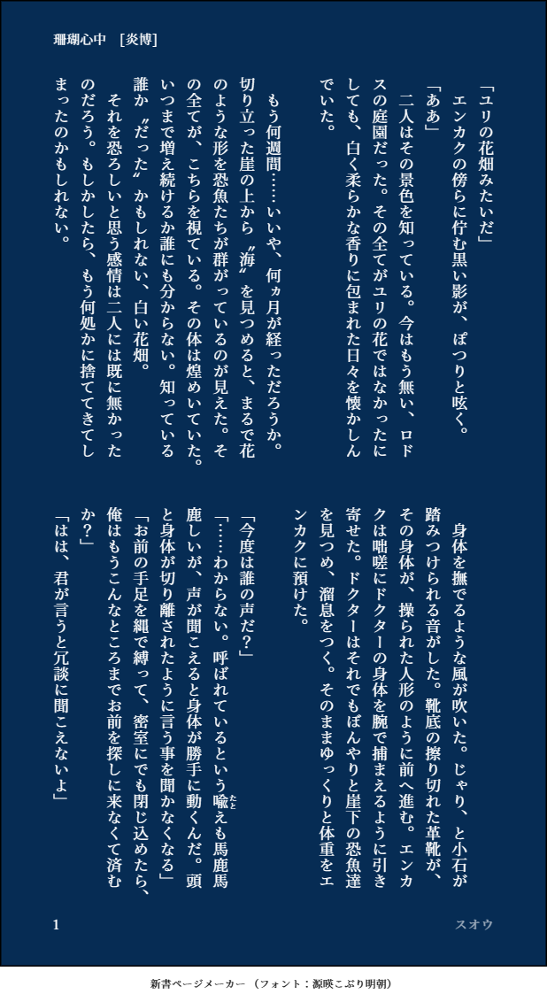スオウ☆quiet followSPUR ME[珊瑚心中] 海の話 イマジナリー炎博 show all(+1 images) Tap to full screen (size:618x1132).Repost is prohibited Let's send reactions! freqpopularsnackothersPayment processing Replies from the creator Follow creator you care about!☆quiet follow スオウMOURNINGR-18/炎博♀サキュバスコスをした博♀に炎が襲われたけど普通にやり返す話1031に上げられなかった哀れな人間 でもまだ私の気持ちはハロウィンだからPASS:R-18↑?小文字で三文字どうぞ 710 スオウDONEナイフ/炎博(性別どちらでも)生息演算の時空の話 博の人心掌握術にあてられる炎(まんざらでもない) 2243 スオウMAIKING炎博♀/R-18書きかけなんですけどテンションを上げるためにあげておきたい!セフレっぽい炎博♀設定ですPASS:R-18↑? 小文字 1738 スオウDONE熱に熟れる回遊魚/炎博(性別どちらでも)致してないけど関係はあるので注意 R-15くらい マグロに関する普通にしもい下品な話 4 スオウSPUR ME[珊瑚心中] 海の話 イマジナリー炎博 2 recommended works 畑耕しマンDOODLE単体❌ 16 みんみDOODLE■成人向け夢絵注意■※18歳未満閲覧禁止何でも許せる人向け。夢主、目隠れで顔あり。あのだらしない身体(好き)の背中に刺青あるのエロイ。あの背中で腰振ってるところが見たい。という欲から生まれた、ただヤってるだけの絵。パス→「役立たず」を辞書で調べると……?(カタカナ4文字) 2 soarienDOODLEcaelussydo not open if you're under 18password: yes/no 2 Silent_star17PROGRESS🐍🍎 wip R1818↑?yes/noめっちゃ奥まで突っ込まれた時のお顔迷ってこれにした 虎の人SPOILER猿隼組スタヒロ前編ネタバレ感想FA。このバディ良すぎて後編を待たずに前編好きどころ描いてしまった。後編も物凄く楽しみ🐒🦅あと何故かナポリタンが無性に食べたくなりました🍝 5 queenofthefamilDOODLECoC『GODARCA』げんみ❌自陣〇女教皇の落書き兼ss#GODARCA爆速RTA合宿班 2 海喵几个喵DOODLE骑士姬,算是补档吧,lft那边之前隐藏了,后面恢复的时候审核没给过,想着反正也是坑就没补了,今天突然想到可以补在ppk这边观前提示-1、半成品2、早期(入坑第二篇)作品,可能存在严重ooc或者笔力差劲的地方(当然也可能比现在写得好,薛定谔的文笔x)3、好吧勉强重新看了个开头发现已经完全看不下去了,估计是不会补了所以把当时写的大纲放上来了 52598 ハジメPROGRESSアナログ絵も楽しいです☺️少しずつ進めています!#ドラクエ(遊び人) 3 biya_hiSPOILER野狗子と薬師げんみ❌表情の二面性 3