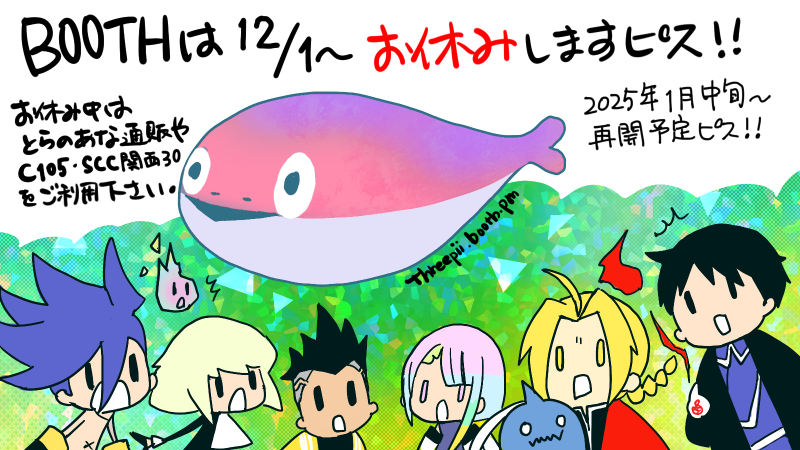【お知らせ】BOOTHは冬季休業にはいりますピス! | シン #pixiv https://www.pixiv.net/artworks/124273387