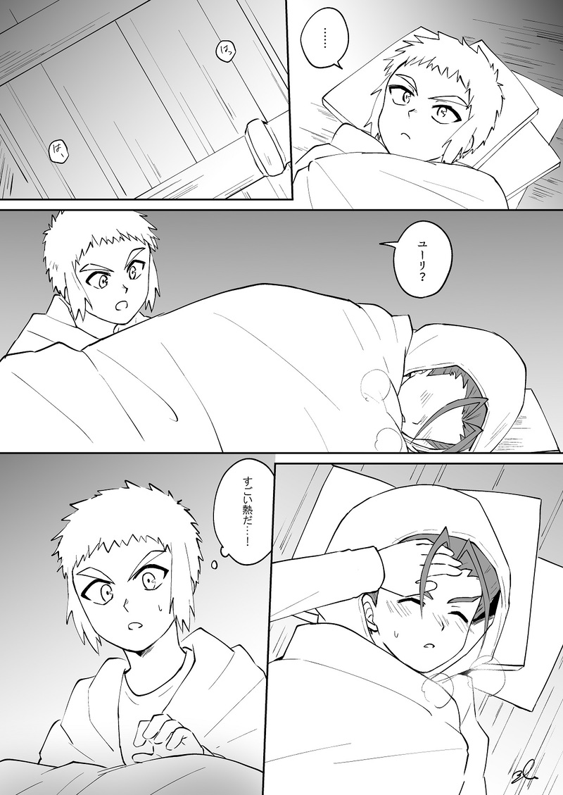 ユーリは熱が出ても隠そうとするけど、いつもと様子が違うことに気付くボリスとか良いなと思います。ボリスが熱出た場合も、隠そうとするボリスとそれに気付くユーリとかいそうです。良いな…