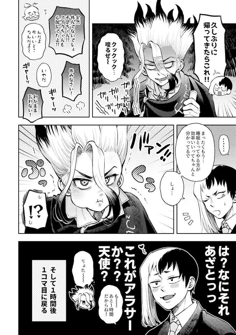 Ran☆quiet followDONEゲン千Webオンリー【ゆい恋】展示漫画🚀博士と🃏外交官の日常1ページ完結漫画✕4です💜💚ラスト2ページ追加しました!モノは見えてないけど背後注意です⚠パスワード公開でしたがイベント終わったので普通に公開します😊 #ゲ千 GenSen ##ゲ千 show all(+3 images) Tap to full screen (size:1000x1419).Repost is prohibited Let's send reactions! freqpopularsnackothersPayment processing Replies from the creator Follow creator you care about!☆quiet follow RanINFO7/13新刊のえちちコマサンプルです!18↑? RanPROGRESSキスの日だったのできっすしてるゲ千の進捗をば RanDONEゲン千Webオンリー【ゆい恋】展示漫画🚀博士と🃏外交官の日常1ページ完結漫画✕4です💜💚ラスト2ページ追加しました!モノは見えてないけど背後注意です⚠パスワード公開でしたがイベント終わったので普通に公開します😊 4 RanDONE👹🚀ちゃん〜 RanDONE蛇🚀ちゃん注意(下半身🐍) RanDONE自覚男子🚀くんの幕間のお話「柔軟男子🚀くん」です。 7 related works ちゃづDONE描いたやつその1※茨あん、ジュンあん 17 きくちゃんDOODLEサタン様犬好きかと思いきやロクサーンみたいなパターンもあるのでやっぱ人外思考なのかな~ わたさくDOODLE ココノカSPOILER幻覚なので全くネタバレではないけど1072話の発言ネタ きくちゃんDOODLEサタン様犬好きかと思いきやロクサーンみたいなパターンもあるのでやっぱ人外思考なのかな~ nnnnnnoodderaDONE【腐向け】チャバが酔ってハ崎さんに甘えてる漫画。ハ崎さんがトイレに行くのを我慢していたりする。 4 べこDOODLEピンク色のバレンタインなヨウグズ🍫 2watoyoDOODLE【朝のボールペン落書き】【日楠♀】【先天性女体化】日高先輩×男装後輩サキュバス家系楠ちゃん。海編。本当に気にしてるのは。 ちゃづDONE描いたやつその1※茨あん、ジュンあん 17 recommended works akiranhinaTRAINING貴方はゲ千で『空腹に効くクスリってありますか』をお題にして140文字SSを書いてください。空腹に効くお薬があります自分のお腹から可愛い音が鳴る。 同居人の彼は自分の思考に没入していて俺のことなんかそっちのけ。 少し前に傾いて露わになった首筋を吸い上げるとびくりと彼が震える。 「何してんだ、テメェ」 軽く運動してよりお腹を空かせた方がご飯も美味しいに違いない。 俺は企みを含ませ笑顔で提案した。 140 akiranhinaMOURNING貴方はゲ千で『空腹に効くクスリってありますか』をお題にして140文字SSを書いてください。再チャレンジしたが、何も始まらなかった…「空腹に効くクスリってありますか?」 少し舌足らずな声に振り返ると視界には誰も居なくて、視線を下げると先っぽが緑のふさふさした逆毛の子供が眉を下げて困り顔をしていた。 ゲンは首を傾げる。ここはコンビニで、ドラッグストアじゃない。そもそも空腹は薬で紛らわしてはダメだろう。 135 akiranhinaTRAININGあなたは【ゲ千】で【妖精のしわざ】というお題に沿って140字でSSを書きましょう「ぁ?そりゃぁ、妖精のしわざっつうんだ」「あの子はきっとチェンジリングなのよ」 聞き慣れない言葉にゲンは首を傾げた。 公園によくあるママ友の輪の中で上がった話題だ。 ゲンはたまたまその近くに居てその言葉を耳が拾った。 子供の好奇心で話題の主に直接尋ねる。 白菜の王子様みたいな少年は耳を穿りながらきちんと答えてくれた。 139 akiranhinaTRAININGあなたはゲ千で『モノタリナイ』をお題にして140字SSを書いて下さい。「こちとら初心者なんだ。たりぃことしてんじゃねぇーよ」ゲンとキスをする仲になった。 朝起きてキスをして、出掛ける時もキスをして、人目を忍んでキスをして、夜寝る前にキスをする。 「どうかしたの?千空ちゃん」 「なぁ、キスってABCのAだよな?」 「ぶふっ。そ、そうだねー。一般的には」 「次に進むのは、いつだ?」 「そ、そのうち、ね」 139 akiranhinaTRAININGあなたはゲ千で、【こぼれ落ちたのは】をお題に140字SSを書いてください。こぼれ落ちたのは涙?汗?それとも恋情?何でテメェが泣いてんだよ一滴、また一滴と。 器を満たさんとする雫は、盃の縁を滑り落ちていく。 溢れた感情はとうとう管制を失ってしまった。 自分がどんなに汚れていようとかまわなかった。 大切な君が笑って光の中を行くなら。 組み敷いた君はなぜ笑っている? そっと伸ばされた指先が目元に触れる。 「ばぁか」 138 akiranhinaTRAININGゲ千へのお題は『果てなど無いと思っていた。』から始まる文章です。テメェが居ないとはじまらねぇ果てなど無いと思っていた。 どこまでも、どこまでも。 科学と二人三脚で息の根が止まるまで走るはずだった。 走るうちに仲間は増えて、大きな計画も出来るようになった。 復興して、メデューサを駆逐して、やがて、自分の好きなことをするようになって。 違和感に立ち止まった。何かが足りない。 140 KazemachiDOODLE今年もよろしくお願いします🎍🃏🚀🦇🐰 2 KazemachiDOODLEぬいとげせ 5 KazemachiDOODLEただいま、干空ちゃん月への片道切符の事もあり🚀ちゃんは『置いていく方の人』だと思って