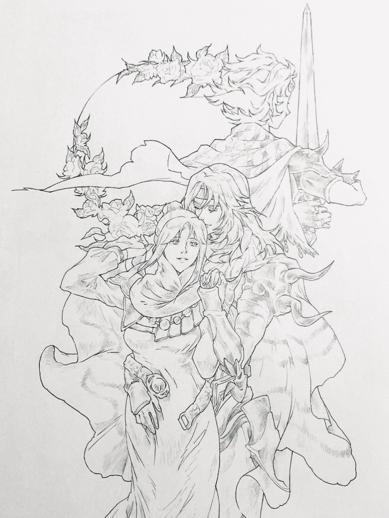 背景は分かりにくいですが月に薔薇が覆っています。月はセシル、薔薇はローザをイメージしていて、ローザって優しい薔薇の香りがしてきそうな女性だと思い、セシルにクンクンさせてみました。