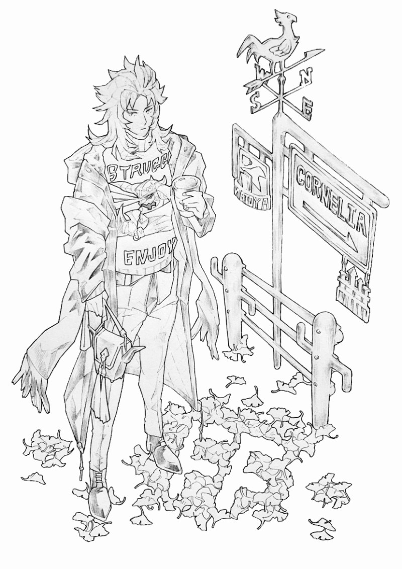 線画完成、地面に対してFF文字のパースを敢えて崩してみても良いのではと思い、見せたいものを優先する描き方をしてみた。正確に描くと文字が分かりにくくなってしまうので…パース知識は未熟だけどもこの描き方で挑戦してみたかった。