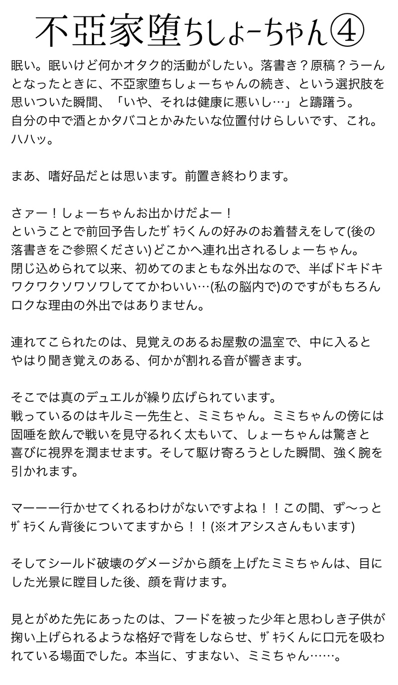 yon8jet☆quiet followDOODLE※不亞家堕ちしょーちゃんネタメモその4※ザキ勝ミミちゃんへの謝罪の言葉が見つかりません……。でもここやりたかったんだああ……。 ##不亞家堕ちしょーちゃん show all(+5 images) Tap to full screen (size:1200x2067).Repost is prohibited Let's send reactions! freqpopularsnackothersPayment processing Replies from the creator Follow creator you care about!☆quiet follow yon8jetDOODLE※公式の女装しょーちゃんヤバいなこのドレス……フリルへの執念が……って思ってたんですけど描き出したらこれ……これ……ンンンンンン……!!!どけッ!!!ワシがやるーーー!!!そもそもこのタイプのドレスには帽子が必須じゃろがい!まかせろヴィクトリア朝のトンチキ帽子ならしょーちゃんの髪型だって受け止めてくれらあ!ホレ!!!!!!!……?(帰ってきた正気) yon8jetDOODLE※しょーちゃんはだけてるある朝、ぽちっと目を覚ました瞬間脳裏に浮かんでその日1日消えなくなった浴衣のしょーちゃんです。どういう、ことだ……🔪 yon8jetMOURNING※黒勝エッ描きかけ供養ちょっとちゃうねん……となったので没にするんですが髪の毛がんばったのになあ…と思ったのでここに…。次回のワンシーンです。 yon8jetTRAINING※白勝白2p漫画※チューしかしてない描いてみてしみじみ脳内白凰様って「しょーぶくんが好きだ!」ってめちゃデカ勢いすごい感情でワーーーッて攻めもするけどいざしょーちゃんが自分に欲情して攻めてきたらそれはそれで「しょーぶくん好き!」ってなってメロメロになるな……とわかりました。やっぱり私は白勝白になっちまうなあ……。 2 yon8jetDOODLE※ザキ勝※不亞家堕ち設定のえっちなしょーちゃんのらくがき※身も蓋もないなこの注意書き……モロに見えてるとかはないんですが100%ヤっとるので鍵付き。18歳以上ですか?→y / n 2 yon8jetDOODLE※龍勝※デェプレシティバトネタカレーパンを食べる切札勝太の汚れた口の端を拭いてやるドラゴン龍???ネットと同人誌で100万回見たやつだ!!!と思いました。 recommended works 五十嵐PROGRESSっし!下書きほぼ終わり!※おわったとは言ってない#遊戯王 五十嵐PROGRESSわに#遊戯王 五十嵐PROGRESS剣山描いてたはずなんだけどなぁあああああああ気づいたらカニ頭になっててくそわろてる。俺の中ではGXより5D'sのが肌にあってるなぁ#遊戯王 たい焼きひよこ平丸DONE塗る前の方がよかったような気がする加工の仕方をがんばろうね! cwcDONE #遊戯王 #アテム #海馬瀬人 #バクラ #闇マリク #青眼の白龍Merry Christmas 3 桧井(ヒノイ)DONEどぎついカラーはかわいい cwcTRAINING #遊戯王 #海馬瀬人 みずのDOODLE投げるとこまちがえーた くりきPASTygo推し。5人描いて飽きてしまったのが出てきたのでサルベージ。2月ごろの絵。 4