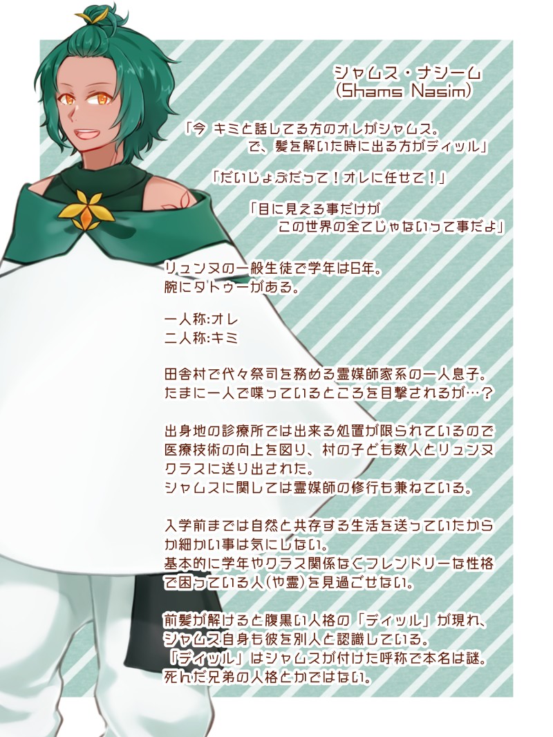 ノヽシ关リ☆quiet followDONEシャムス・ナシーム(Shams Nasim)/ディッル(zil)18歳/175㌢CVイメージは未定(やや高め)「ヴェリテ魔法学校」に参加させて頂いている4人目 #創作 creation ##企画 ##ヴェリテ ##設定 show all(+2 images) Tap to full screen (size:1500x2000).Repost is prohibited Let's send reactions! freqpopularsnackothersPayment processing Replies from the creator Follow creator you care about!☆quiet follow ノヽシ关リDOODLE※峰猫のみ非公式髪型 ノヽシ关リPROGRESS2019年の下書きを2025年に描き直している…(震え声)前より好みに描けているという成長 ノヽシ关リDOODLEキュート系猫少年・峰猫(フェンマオ) ノヽシ关リDOODLE ノヽシ关リDOODLE 2 ノヽシ关リDOODLE related works 糸吉糸PAST教会周り 5 ななめPASTアキラとマサ設定(社会人編/同居編)。テンプレお借りしています。最後の間取りは同居中の部屋。自分用備忘録。忘れそうなのでメモ。マサの母親の旧姓は河野なので、マサの名字は田中→河野→東海林と変わっています。だんだん壮大になっている(*^▽^*) 11 チェラテDOODLE2019/01/17 19:26:271匹にゃんこを増やしましたスコティッシュフォールドが犬に見えるのなんの… 4 チェラテDONE大幅に変わったというか衣装変えたに等しいです2019/03/09 23:34:02すごく手間かかりました(:3 」 ∠) チェラテDOODLE残り2骨いますがそっちは能力は比較的別なのでそのままスケルトンというモンスターでいきたいと思います。リモッカくんです。これで一次創作と言い張れます。多分。 3 糸吉糸DOODLE自創作に於ける魔法・魔術・魔力について チェラテDOODLEあまりにも描けないのでなう(2019/03/11 20:00:20) チェラテDOODLE二ソートくんの形を変えたので多分これで一次創作と言い張れます 4 ななめPASTアキラとマサ設定(大学生編)。サイトを閉鎖したのでこちらに移しています。自分用備忘録。 15