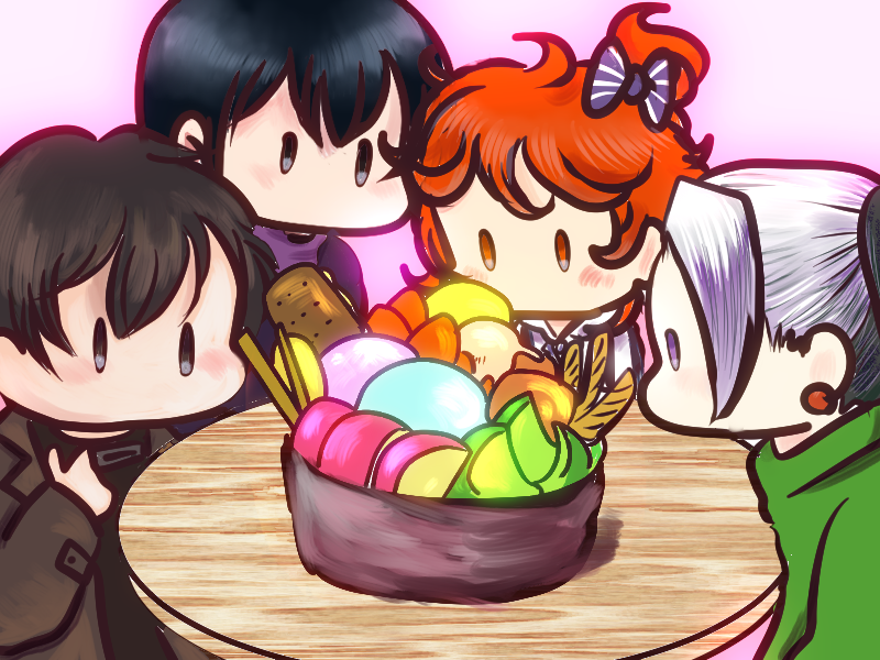 自分のつぶやきhttps://twitter.com/kusanabePF/status/1490285668693843970を有言実行しようとお絵描きしました、庭師猩々班のとある休日(とおもって描いたけどパフェの色がSANチェックな輝きを放っている)