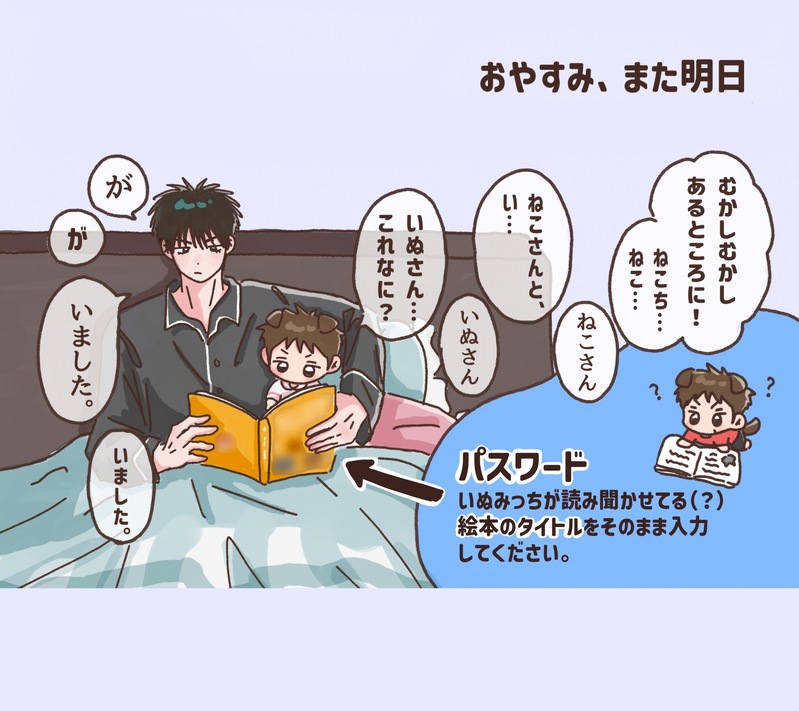 ▶︎パスワードは、「おやすみ、また明日」に登場する絵本のタイトルを入力してください。(12文字)