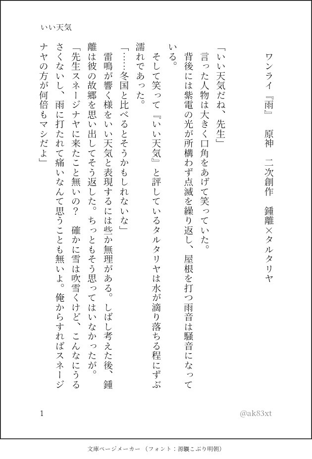 ako☆quiet followDONE『いい天気』二次創作 鍾タル ワンライ 『雨』雨なんて口実でしかない。 show all(+3 images) Tap to full screen (size:630x928).Repost is prohibited Let's send reactions! freqpopularsnackothersPayment processing Replies from the creator Follow creator you care about!☆quiet follow akoDONE宝石商のタルと先生の話しです。二次創作 鍾タルふぁでゅーやってないタル。名前的には鍾アヤ。誕生日関係無い話しだけど、タルちゃんおめでとう🎉 6 akoDONE神様先生×人魚タルの続き。二次創作 鍾タル※一個前→https://poipiku.com/7339560/9067969.html人魚タルは我儘プリンセスです。可愛いから許して下さい。タルの精神年齢幼め💦書きたい所までまだ辿り着いてないので、まだ続きます……。https://privatter.net/p/10225008↑横書きで読みたい人向け 10 akoDONE夏の思い出作り。二次創作 鍾タル ワンライ 「ひまわり」 8 akoDONE※人魚パロ二次創作 鍾タル ワンライ 「素足」要素は薄いけど、神様先生と人魚タル。 8 akoDONE『マイナスにマイナスかけてもプラスにならない』二次創作 鍾タルワンライリベンジしようとしたけど、今週はダメダメだった。一応テーマは『夏』だよ。 3 akoDONE『終わり良ければ総て良し』鍾タル 二次創作よくある勘違いハム子で無自覚ハム子。様式美。 7 recommended works yktukiDONE知らぬ間に同人誌が発行される鍾タルの話。10割モブしか話してないです。 6778 nononononomigDONE鍾タル(別垢に上げたのと同じ) 2 23_kanzakiDONEExhibit 2The last cartoon was translated by a follower! 14 chaco1130mintoDONE鍾タルオンリー開催おめでとうございます☺️二人の初夜のお話を描きました😂 3 watersky_qDONE鍾タル。7/24ワンライ「祝福」より。お誕生日後日談な鍾タル。 3206 chkdoeDONE🔶💧zl possessive 💯 雨煙🥟DOODLEおだんご 12 Chixaaa_DONEGeez rick, I can't handle your damn big hard dick anymore😥🥺 aqua_milgaziaDONE鍾タル ZhongChiR-18 NFSW 全部捏造えすえむプレイするのが見たくて描いたブツは排泄してないけど、浣腸やお漏らし、鞭、ちょっと血表現などいろいろあるので何でも許せる方のみパス18↑(y/n) 6