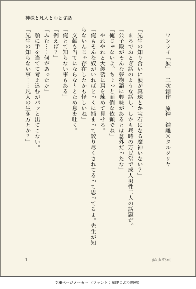 ako☆quiet followDONE『神様と凡人とおとぎ話』二次創作 鍾タル ワンライ 「涙」1h+α「涙が真珠とか宝石になる魔神いない?」そんな話です。 #鍾タル zhongchi show all(+5 images) Tap to full screen (size:630x928).Repost is prohibited Let's send reactions! freqpopularsnackothersPayment processing Replies from the creator Follow creator you care about!☆quiet follow akoDONE宝石商のタルと先生の話しです。二次創作 鍾タルふぁでゅーやってないタル。名前的には鍾アヤ。誕生日関係無い話しだけど、タルちゃんおめでとう🎉 6 akoDONE神様先生×人魚タルの続き。二次創作 鍾タル※一個前→https://poipiku.com/7339560/9067969.html人魚タルは我儘プリンセスです。可愛いから許して下さい。タルの精神年齢幼め💦書きたい所までまだ辿り着いてないので、まだ続きます……。https://privatter.net/p/10225008↑横書きで読みたい人向け 10 akoDONE夏の思い出作り。二次創作 鍾タル ワンライ 「ひまわり」 8 akoDONE※人魚パロ二次創作 鍾タル ワンライ 「素足」要素は薄いけど、神様先生と人魚タル。 8 akoDONE『マイナスにマイナスかけてもプラスにならない』二次創作 鍾タルワンライリベンジしようとしたけど、今週はダメダメだった。一応テーマは『夏』だよ。 3 akoDONE『終わり良ければ総て良し』鍾タル 二次創作よくある勘違いハム子で無自覚ハム子。様式美。 7 related works nodaniziDOODLEモラ狐の本かきた~~~いという落書き 2 ayngdGSDONE🔶🐳首輪と鞭 🔞(再掲) 2 JH_ZhChDOODLE⛔️⚠️Hard Gore, internal organs, blood shed⚠️⛔️⛔️⚠️血, 内臓⚠️⛔️⛔️⚠️내장, 유혈, 고어함 주의⚠️⛔️ falyyDOODLE鍾タル office AU 3 ayngdGSDONE🔶🐳オナニーです 🔞(再掲) 2 watal_lllPROGRESSセッしないと出られないご都合秘境リオヌヴィ進捗。ようやっと本番前まできたので一旦まとめ。鍾タルがセットいるので要注意。 16226 aqua_milgaziaDONE相互さんの誕生日絵でふぁんあーと描かせていただきました!!マフィアパロ鍾タルSMです!!!https://twitter.com/_Eiagnsn/status/1497125811140239363?s=19 3 Rei_gt11DONE鍾タル♀ こねぎCAN’T MAKE照れタルrkgk(鍾タル風味) recommended works のくたの諸々倉庫DONE等身大のしあわせを/鍾タル(いや起きてるけどね。ストレートに誘わないといけないかあ……ピュアすぎるよ先生……)とか思いつつ嬉しいタルはいます 898 narukaze_CAN’T MAKE見た夢を忘れる前にメモ夢なんで支離滅裂息をするように女体化してたりしてなかったり 202 @piz_tkDONEモラクス×邪タルのエロ。https://poipiku.com/IllustViewPcV.jsp?ID=792653&TD=4645998これの続き?ッぽいやつです。PASS➡成人済ですか?yes/no 3 chaco1130mintoDONE鍾タルオンリー開催おめでとうございます☺️二人の初夜のお話を描きました😂 3 長(なが)DOODLEお題「海」「休暇」7/31のワンドロお題借りてセルフで描いたやつ 2 ぺいおさんDOODLEショタルリヤ 雨煙🥟DOODLEおだんご 12 gk967427DOODLE離達一些私設下收鐘離28←住在胡桃家(往生堂),其實有錢但是總不帶錢便被誤會很窮只能住別人家阿賈克斯(公子)19←至冬國人,跑來璃月留學,對鐘離一見鍾情(見色起意)魈19←被鐘離撿回家,看阿賈克斯不順眼,因為被戳到了痛處(身高)胡桃16←家裡開葬儀社(往生堂),被爺爺託付鐘離照顧,把魈當朋友兼兄長看待熒16←鄰居,跟魈、胡桃一同長大,有一雙胞胎哥哥(空)可以接受在繼續往下看 2446 @piz_tkPAST2022年5月に出した個人誌(鍾タル)をweb再録しました。下手したら消すし、気が向いたらこのまま残しておく…PASS➡成人済ですか?yes/no 23
