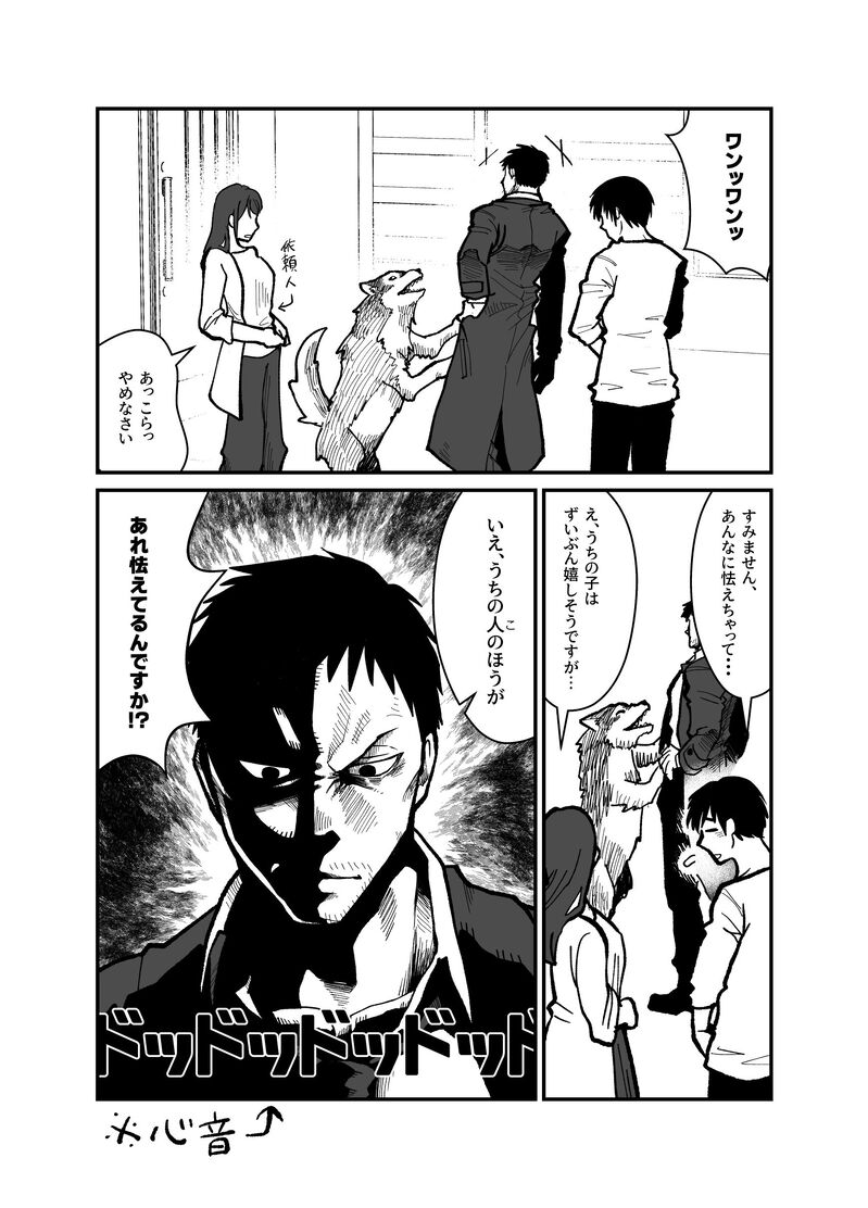 「依頼人の家で犬から熱烈歓迎を受け動けなくなるKK」です。