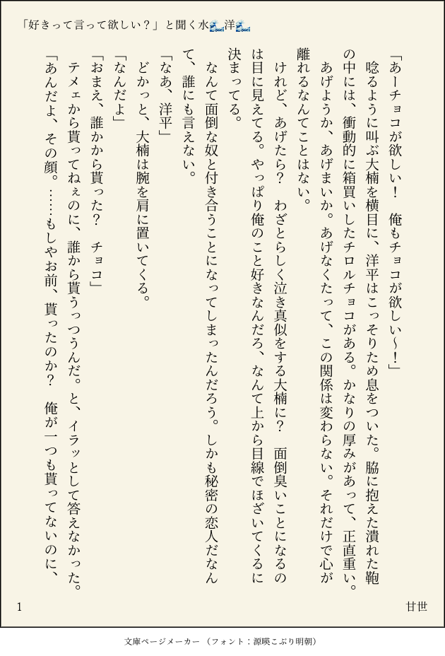 甘世(かんせ)☆こそフォロできた「好きって言って欲しい?」と聞く水🌊洋🌊#みと恋R #みと恋Rお題箱執着強めの楠と満更でもない洋の楠洋です。バレンタインデねた。 すべて表示(+2枚) タップで全画面(原寸:630x928)無断転載禁止 リアクションをたくさん送って応援しよう! よく使う人気おやつその他支払処理中 作者からのリプライ 気になる人をどんどんフォローしよう!☆こそフォロ 甘世(かんせ)できた彼氏と一緒に料理をする水🌊洋🌊#みと恋R #みと恋Rお題箱山も落ちも意味もないリョ洋です。素面のリョと酔っ払ってる?洋の二人が、いちゃいちゃしながら料理?するお話です。下ネタです。 7 甘世(かんせ)できた「好きって言って欲しい?」と聞く水🌊洋🌊#みと恋R #みと恋Rお題箱執着強めの楠と満更でもない洋の楠洋です。バレンタインデねた。 3 甘世(かんせ)自主練彼氏のはじめての染髪を手伝う水🌊洋🌊リョが最後にニヤニヤしてるのは、初めての染髪がちょっと楽しみだからです。手先の器用な洋だといいね。リョ洋です。#みと恋R #みと恋Rお題箱 4 甘世(かんせ)できた「好きって言って欲しい?」と聞く水🌊洋🌊リョ洋 #みと恋R #みと恋Rお題箱いつものリョ洋です。いちゃいちゃ。洋はきっとリョと同じだけ緊張したり照れたりしてるだけだと思う。 3 甘世(かんせ)できた彼氏に服を脱がせてという水🌊洋🌊リョ洋えっろ #みと恋R #みと恋Rお題箱クリスマス、軽い拘束、くすぐり、チク○責め 6 甘世(かんせ)できた酔っ払った相手を介抱する水🌊洋🌊#みと恋R #みと恋Rお題箱楠洋です。普通の楠洋が書けたのでお披露目です。ちょっぴり下ネタ入っています。同い年。よく知った友だちだからこその空気感を大切にしたいよね。 4 同じタグの作品 甘世(かんせ)できた彼氏に好き好き言われて照れまくる水🌊洋🌊#リョ洋 #みと恋R #みと恋Rお題箱すぐにいちゃついてしまう 2 甘世(かんせ)できた酔っ払った相手を介抱する水🌊洋🌊#みと恋R #みと恋Rお題箱楠洋です。普通の楠洋が書けたのでお披露目です。ちょっぴり下ネタ入っています。同い年。よく知った友だちだからこその空気感を大切にしたいよね。 4 甘世(かんせ)できた彼氏と一緒に料理をする水🌊洋🌊#みと恋R #みと恋Rお題箱山も落ちも意味もないリョ洋です。素面のリョと酔っ払ってる?洋の二人が、いちゃいちゃしながら料理?するお話です。下ネタです。 7 甘世(かんせ)できた文化祭でメイド服を着る水🌊洋🌊#みと恋R #みと恋Rお題箱リョ洋です。すぐに青春キラっちゃう 2 甘世(かんせ)自主練彼氏のはじめての染髪を手伝う水🌊洋🌊リョが最後にニヤニヤしてるのは、初めての染髪がちょっと楽しみだからです。手先の器用な洋だといいね。リョ洋です。#みと恋R #みと恋Rお題箱 4 甘世(かんせ)できた「好きって言って欲しい?」と聞く水🌊洋🌊リョ洋 #みと恋R #みと恋Rお題箱いつものリョ洋です。いちゃいちゃ。洋はきっとリョと同じだけ緊張したり照れたりしてるだけだと思う。 3 甘世(かんせ)できた女に優しく男に厳しい水🌊洋🌊#リョ洋 #みと恋R #みと恋Rお題箱ちょっとお題の内容と違うかもしれないけど、リョ本人はそう思ったよっていうリョ洋です。 2 甘世(かんせ)できた彼氏に服を脱がせてという水🌊洋🌊リョ洋えっろ #みと恋R #みと恋Rお題箱クリスマス、軽い拘束、くすぐり、チク○責め 6 甘世(かんせ)できた「好きって言って欲しい?」と聞く水🌊洋🌊#みと恋R #みと恋Rお題箱執着強めの楠と満更でもない洋の楠洋です。バレンタインデねた。 3 おすすめ作品 EY (えい)できたきつねっ娘 やさしいおでんできた熱血物語SP おまけ効果 dom387676らくがきテスト 3 kagekiri108らくがき伊吹くん誕生日おめでとう〜〜!! dom387676らくがき🦐☀️ 369 masudanosousakuできた新名 健 3 インスタントロゼワインできたクリス差分多め 5 かよわい☆巡るらくがき今日の怒られた絵 かえでらくがきルイ…ク…さんの例のやつ🍾があまりにも美だったので…の落書き一応パスかけますpass:英字3文字