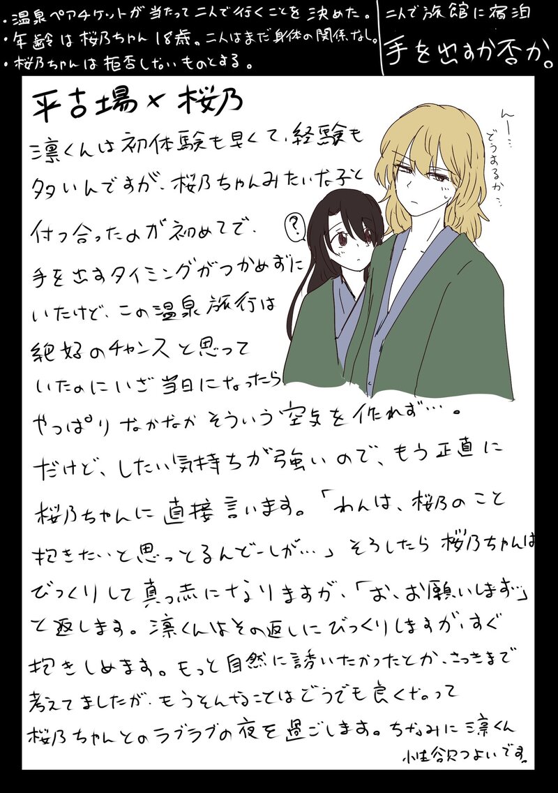 Saku_0495☆quiet followDOODLE桜乃ちゃん受けの温泉旅行妄想ログマンガでもイラストでもないただの妄想。内容はちょっと大人向けなので苦手な方は注意してください⚠ #温泉旅行妄想 onsenTripFantasy show all(+7 images) Tap to full screen (size:1442x2048).Repost is prohibited Let's send reactions! freqpopularsnackothersPayment processing Replies from the creator Follow creator you care about!☆quiet follow Saku_0495DONEリョ桜で初詣ネタ。5ページです。 5 Saku_0495DOODLE最強チーム設定。桜乃ちゃんリーダーの、裕太、海堂、切原、日吉のチームです。 3 Saku_0495DONE既刊の最強チームのリーダーを桜乃ちゃんが頑張る本です。メンバーは裕太、切原、日吉。4コマ。A5/24P/300円残り僅少。BOOTHからどうぞ!https://sakurai95.booth.pm/items/1200500 3 Saku_0495DOODLEリョ桜ログほぼ誕生日の話。※ひとつだけリョ桜王子があります。 15 Saku_0495DOODLE最強チーム設定、メンバーは観月リーダー、桜乃ちゃん、赤澤、裕太、伊武くんですが、気持ち観月桜です。実際に南次郎がフラッと勝負しかけてくるイベントで妄想しました。 3 Saku_0495DOODLE桜乃ちゃん受けの温泉旅行妄想ログマンガでもイラストでもないただの妄想。内容はちょっと大人向けなので苦手な方は注意してください⚠ 8 related works Saku_0495DOODLE桜乃ちゃん受けの温泉旅行妄想ログマンガでもイラストでもないただの妄想。内容はちょっと大人向けなので苦手な方は注意してください⚠ 8 recommended works Ricorico234MOURNINGリョ桜未来ネタSS。n番煎じネタすみません。モブが出てくるので注意。最近リョ桜が盛り上がってて嬉しい。初めてSS書いたので、変なところは大目に見て下さい。 10 OwarinnnnnDONEやや肌色大人リョ桜 kan_twt_kanDOODLEツイートするほどではないやつ 10 Saku_0495DOODLEブン桜ログ らくがきばっかり 7 tokidokihikoINFOかにこさん(@nikoinoillust)がリョ桜既刊の表紙を描き直してくれました♪ローソンにてネップリできます!是非既刊の表紙と神絵を比べて見て下さい🤣とても勉強になります(笑)何より、普段リョ桜を描かれない方の貴重なリョ桜をこの機会に御堪能下さい♪ tanitboxDONENipple play and bondage with zhongli and childehttps://twitter.com/tanitbox/status/1606592757186822145 yukitori_rokkaDOODLE発掘したしょうもない黒獪のラクガキなど 4 katakuri_m42DONE🥢☀※妊娠ネタ 2589 ponuponu_nuMEMO