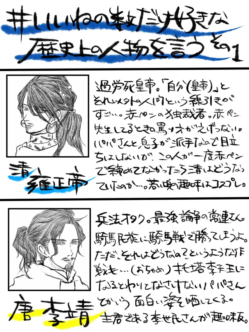 yasui39☆quiet followMOURNING雍正帝と李靖 #歴史 history #創作 creation Tap to full screen (size:1024x1365).Repost is prohibited Let's send reactions! freqpopularsnackothersPayment processing Replies from the creator Follow creator you care about!☆quiet follow yasui39MOURNING人選が謎すぎる顔特集 2 yasui39TIRED霍光を交えた面白話を書きたい……… yasui39DOODLE塗り絵索超 yasui39CAN’T MAKE林冲と公孫勝#北水 yasui39MOURNING張儀と趙普 yasui39MOURNING雍正帝と李靖 related works _caccotojiDONE🌿 若松ハルキ/春樹DOODLE #アナログ #創作ネズミさんとネズミちゃん。 宙兎帆羽PASTヘッダーのヤツ #創作 #オリキャラ みなせDOODLEお試し登録です。いい感じなら続けて利用したいと思います。 小雀黎DONE結局青くしました。青が似合う。簡単な塗りにしてみたけど、合う合わないは分からない…… ねねこDONEテスト的なアレ的なアレ特に深い意味はない#創作 amejiyaPAST創作曲ネタ絵 15 はしくんMAIKING初めてiPad Proで絵を試し書きまだ慣れないし疲れたので途中放置…。 かえでDOODLE recommended works nemuDONEうちの子資料〜〜 10 grass1jackPAST『NO TITLE.』雨(シュローヴァイス) monoDOODLE00課其伍の3人秋冬服 みわこTIREDチューリップと心名 かぎょうPASTアナログ 10 poco_nazoPASTweb拍手のお礼画面に使っていた絵 春時雨DOODLEさあ、、瓶の好きなものを詰め込もう ウニDOODLE アレクサンダー勇輝DOODLE先代だ!##ミルクボウル220 #創作