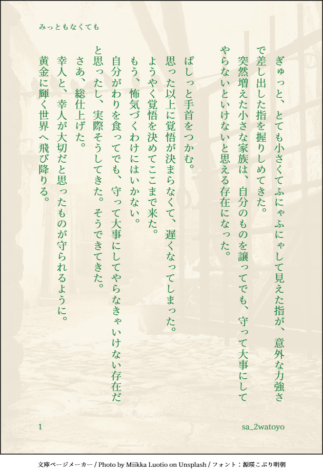 2watoyo☆quiet followDOODLE #あやかい真剣60分一本勝負第78回 選択テーマ【ぎゅっ】【澪標】カプなし。尽中心、尽+幸。※アニメ一期のネタバレを含む散文的な感じです。短い! 500字弱(画像2枚) #あやかい真剣60分一本勝負 #文庫ページメーカー paperbackPageMaker #沙川尽義 #八凪幸人 show all(+1 images) Tap to full screen (size:630x928).Repost is prohibited Let's send reactions! freqpopularsnackothersPayment processing Replies from the creator Follow creator you care about!☆quiet follow 2watoyoDOODLEフリル立ち襟。……かわいいね。 2watoyoDOODLEドルマンスリーブ。ポンチョみたいなのもあってかわいい…… 2watoyoDOODLE【朝のボールペン落書き】【日楠♀】【先天性女体化】日高先輩×男装後輩サキュバス家系楠ちゃん。フレンチスリーブ、我慢ならずにかいた…… 2watoyoDOODLE【女装】原くん。(ごめんな。あとはサキュ楠ちやんしか描く気になれなくて)←フレンチスリーブ。袖が縫い付けられてるわけじゃないやつ。基本女性向けっぽく見える検索結果。 2watoyoDOODLE【女装】原くん。自分の推しカプだからって、誰でもメイド服着てくれるわけじゃないんだな……って思いながら昨日某カプのハロウィンのネタ考えてたせい……。 2watoyoDOODLEラグランスリーブ。ななめに袖がついてる→腕上げたりがしやすい。そう。 related works 2watoyoDONEタグ:いいねされた数だけ書く予定のない小説の一部を書く 202506_01あやか>幸+尽変装して、一ノ島の高級カジノに乗り込む話。【注意】なんでも許せる方向け(具体的なことを書いてしまうとネタバレになるので、そう書いておく。……バレバレかもしれないけれど) 1882 2watoyoDONE #あやかい真剣60分一本勝負第20回 選択テーマ【どん底】超過去お題、失礼します。m(__)m(内容と……茶太郎くんと夜胡くん描けないのと……) 2watoyoDONEタグ:いいねされた数だけ書く予定のない小説の一部を書く 202506_03あやか>幸+百すっかり住み慣れた家で、居心地の悪い思いをするシーン。 417 2watoyoDOODLE #あやかい真剣60分一本勝負第78回 選択テーマ【ぎゅっ】【澪標】カプなし。尽中心、尽+幸。※アニメ一期のネタバレを含む散文的な感じです。短い! 500字弱(画像2枚) 2 recommended works 2watoyoDOODLE【今朝のボールペン落書き】ネーム。【日楠♀】【先天性女体化】日高先輩×男装後輩サキュバス家系楠ちゃん。一昨日の続き。つっこんできいてくる先輩。説明する楠ちゃん。 2watoyoDOODLE【日楠】にゃんことフルーツ集めをしながら暮らす楠くんに、新しいフレンドができました。 2 2watoyoDOODLE【朝のボールペン落書き】【日楠♀】【先天性女体化】日高先輩×男装後輩サキュバス家系楠ちゃん。昨日の続き。なんか言い出す日高先輩。 2watoyoDOODLE【朝のボールペン落書き】【日楠♀】【先天性女体化】日高先輩×男装後輩サキュバス家系楠ちゃん。昨日の続き。自滅する楠ちゃん。 2watoyoDOODLE【朝のボールペン落書き】【日楠♀】【先天性女体化】日高先輩×男装後輩サキュバス家系楠ちゃん。昨日の続き。気になる…… 2watoyoDOODLE【朝のボールペン落書き】【日楠♀】【先天性女体化】日高先輩×男装後輩サキュバス家系楠ちゃん。昨日の続き。きゅうっ。 2watoyoDOODLE本田くん(173cm)、イタちゃん(172cm)より背が高い。9に見えるのはてぐせです。7です。←まて 2watoyoDOODLE【星エコ】おこな本田くん。たまに正しく呼ばれると、いつものように訂正しようとして間違えちゃうやつ。※rt頂いたら描くタグので 2watoyoDOODLE【朝のボールペン落書き】【日楠♀】【先天性女体化】日高先輩×男装後輩サキュバス家系楠ちゃん。ようやくバレンタイン……
