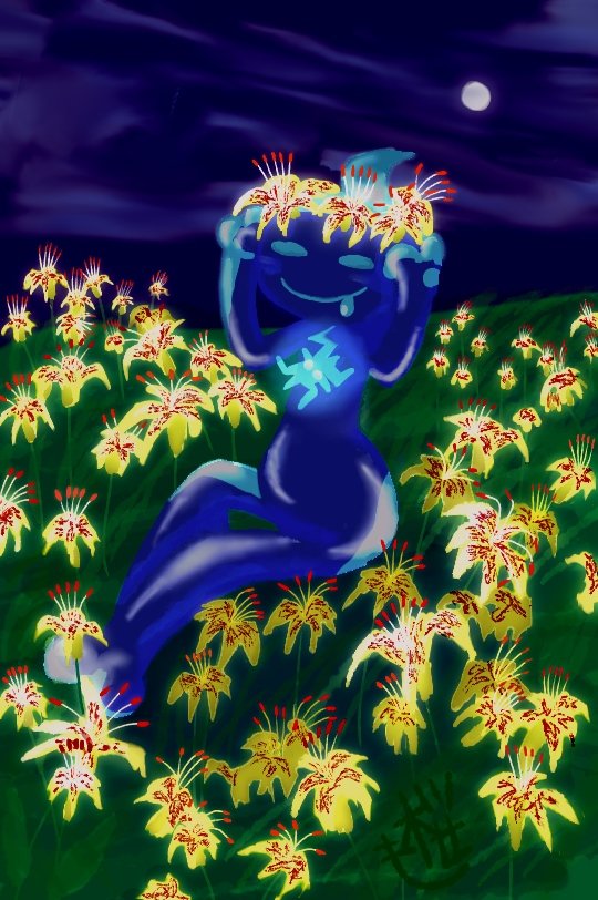 チノイロマダラドクユリ(外見は想像)の花畑にいるエコロ