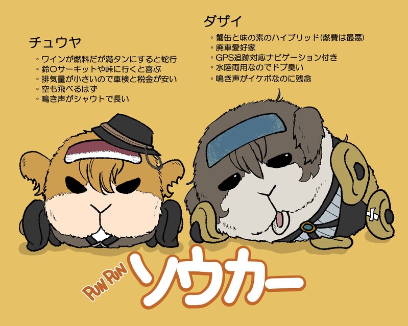 こいつらのせいで原稿描く時間がなくなったけど仕方ない…だって!!アウトプットしないと見るたびに頭に浮かんでたから!!ダザイは基本汚れてるから幹部が見かねて洗車してくれるよ。ちゃんと手洗いで足回りとかドアの内側まで綺麗にしてヤンキーみたいな芳香剤も置いてくれる。ドブ臭いから。チュウヤは太宰が乗ると足がハンドルに当たるし天井に頭着いちゃう。小さいから。私…なんでモルの方で想像してたんだろうね本当。