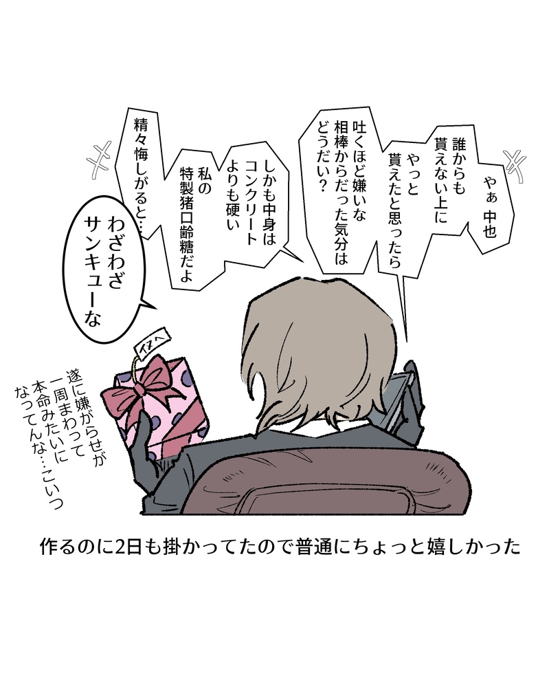 (中也の吠え面を想像して)余りにも楽しそうに作る太宰の姿を見て「好きな人にあげるんだな」って敦君と鏡花ちゃんも一生懸命手伝ったし、試食させられた国木田君も「あの太宰がこんなに一生懸命に…よほど本気なんだな」と思って気合いで飲み込んで褒めてくれたコンクリートチョコ。中也も中也で、他から沢山貰ってるけど誰よりも手間が掛かってて地味に感動したので食べないで飾ってそうでちょっと良い…。