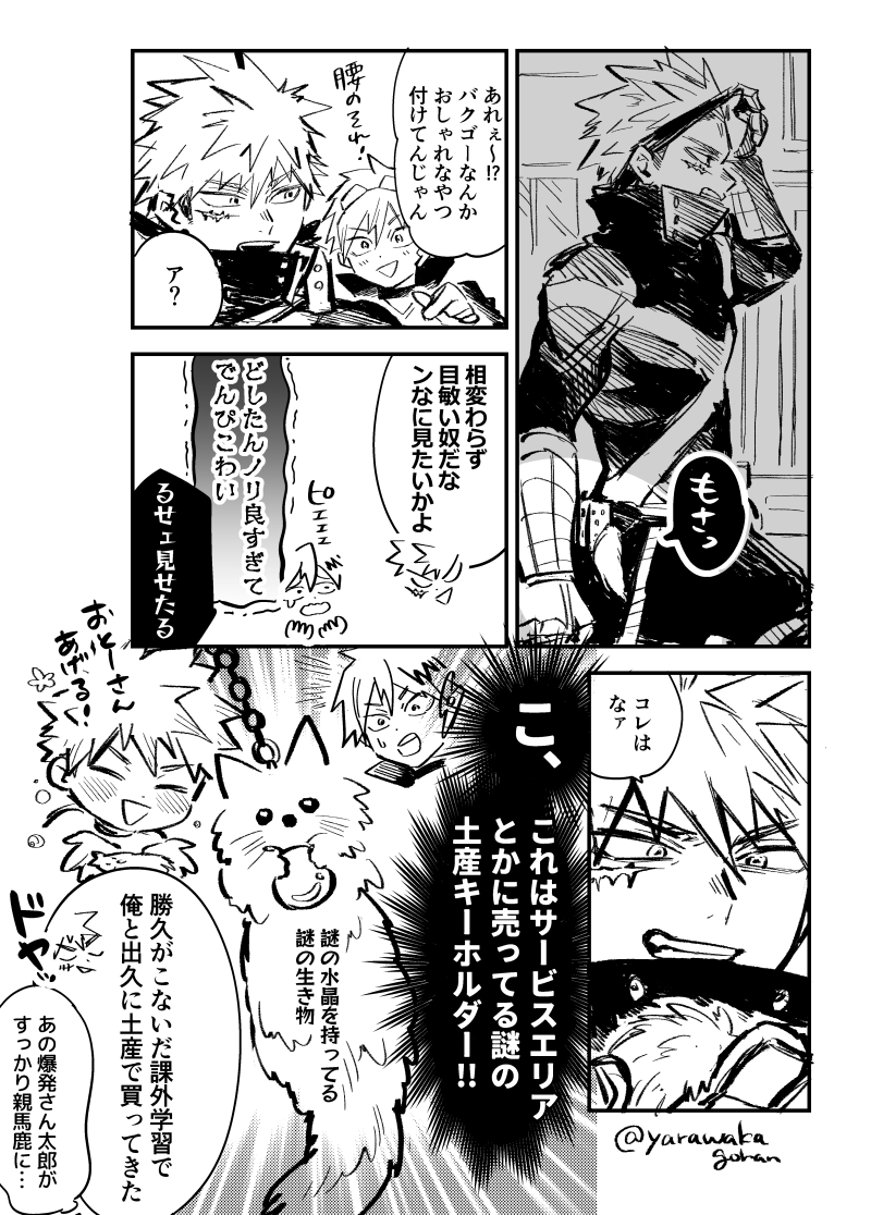 謎のキーホルダー渡されて「ご当地オールマイトじゃねぇんか」って内心ツッコミつつも1000円だけお小遣い許されてるなかお土産持って帰ってくれたことに嬉しかったり付けちゃったりする感じ