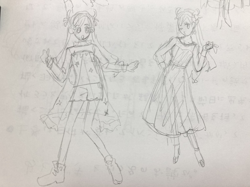 いろいろ服考えてた!難しいのより、シンプルな衣装が良いなーと思ってたけど、何枚もイラスト描くとなると、飽きるなって思いました!(すぐ飽きる)