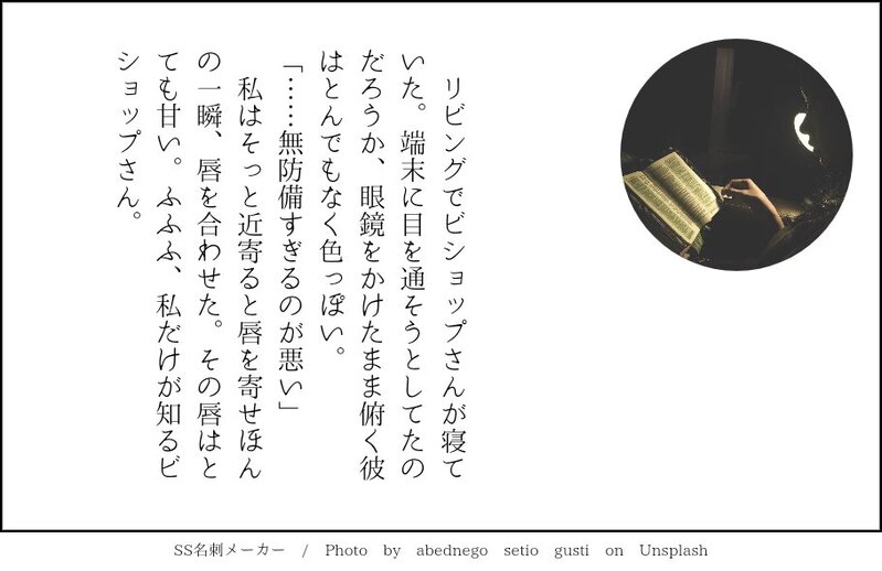 saya_wl☆quiet followDONE貴方はチェンショップで『無防備すぎるのが悪い!』をお題にして140文字SSを書いてください。#shindanmakerhttps://t.co/ig01EVbN54#さやSS幻覚 https://t.co/tw0mrz7rsE Tap to full screen (size:910x590).Repost is prohibited Let's send reactions! freqpopularsnackothersPayment processing Replies from the creator Follow creator you care about!☆quiet follow saya_wlDONE[SS] チェンショップビショップさんが好きなチェンシーてゃん#さやSS幻覚 4 saya_wlDONE[SS]知りたい、知りたい、ただ知りたい(1/2)ビショルキ(ビショップ×一般ルーキー)彼らが付き合う話です。ルーキー若干メンヘラですフニャチンイベント後の話です #さやSS幻覚 8 saya_wlDONE[SS]もしかしたらあったかもしれないいくつかのこと(1/2)チェンショップ。ビショップさんがプロポーズします。■■■はビショップさんの本名だと思ってください。#さやSS幻覚 5 saya_wlDONE[SS]ディアンシー ディアブロ×チェンシーディアブロくんが妬く話#さやSS幻覚 2 saya_wlDONE[SS]チェンショップ(1/2)これもまたWebサイトにあげたものです。つき合ってない二人だったが…しほさんのクリスマスイブ夢の続きです#さやSS幻覚 3 saya_wlDONE[SS]チェン+ビショWebサイトにあげたものです。二人はつきあっていません#さやSS幻覚 3 related works かほる(輝海)DONEシティーハンター冴羽獠×槇村香原作以上の関係書き手募集していたのでびんじょった(*´ω`*)Rさま(@ryu_wen)ありがとうございました!Rんちの冴羽くんと香で「唇」と「「ばぁか」」のお話はどうでしょう? 1ツイート(140字)程度だと嬉しいですっ!#CHしたったー #shindanmakerhttps://t.co/2IQJRYQwf0 かほる(輝海)DONEシティーハンター冴羽獠×槇村香原作以上の関係かほるさんちの香で「生きる」と「地獄」のお話はどうでしょう? 5ツイート(700字)以下だと嬉しいですっ!#CHしたったー #shindanmakerhttps://shindanmaker.com/965157何か暗い感じになっちゃったけど、これで許して…(´・ω・`)この後は二人で天国へ行った(イッた?)に違いない(*´艸`*) 2 opinel432DONETSりんわかBLさんは『もしかして誘ってる?』をお題に、140字でSSを書いてください。#shindanmakerhttps://shindanmaker.com/320966 かほる(輝海)DONEシティーハンター冴羽獠×槇村香原作以上の関係あなたはかほるさんちの香ちゃんで【癖になるかも / 行儀の悪さは艶やかさ】をお題にして140字SSを書いてください。#shindanmakerhttps://shindanmaker.com/780366これはお行儀が悪い方が萌える(*´艸`*) こよみTRAININGこよみんちの獠と香で「バスタイム」と「モーニングキス」のお話はどうでしょう? 1ツイート(140字)以下だと嬉しいですっ!#CHしたったー #shindanmakerhttps://shindanmaker.com/965157ギャグ路線?😅お題の言葉は直接は使ってない😅直接表現はしてないので、全年齢。 SasameREHABILIあなたは細雪んちの獠香で【噛んで微笑ってもう一度キス / あれは嘘だった】をお題にして140字SSを書いてください。#shindanmakerhttps://t.co/FT9UR8u5Hs『血の証』を見た獠ちんからクレームがありまして「書き直せ!!」と言われちまったよ…(*꒦ິ꒳꒦ີ*)獠ちんが悪いんじゃん!! rick_underworldDONE貴方は🌹→☕️で『口説き落としてみせる、って』をお題にして140文字SSを書いてください。2022/12/13そう思っていたのに、#shindanmakerhttps://shindanmaker.com/587150 SasameREHABILIあなたは細雪んちの獠香で【噛んで微笑ってもう一度キス / あれは嘘だった】をお題にして140字SSを書いてください。#shindanmakerhttps://t.co/FT9UR8u5Hs過去最短で書いた気がする( *¯ ꒳¯*)フフン aosabikinakoTRAINING貴方はハル相で『最大級の口説き文句』をお題にして140文字SSを書いてください。#shindanmakerhttps://shindanmaker.com/375517