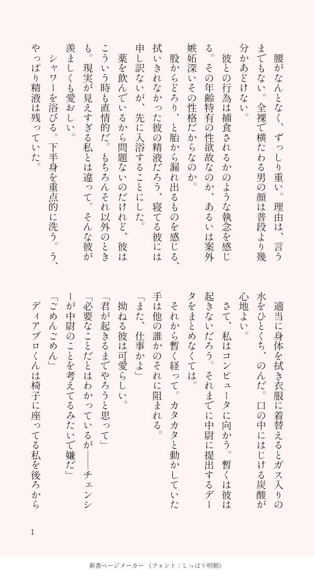 saya_wl☆quiet followDONE[SS]ディアンシーこんな時間ですが。一応全年齢向け。#さやSS幻覚 https://t.co/EjeW2knu1W show all(+1 images) Tap to full screen (size:618x1132).Repost is prohibited Let's send reactions! freqpopularsnackothersPayment processing Replies from the creator Follow creator you care about!☆quiet follow saya_wlDONE[SS] チェンショップビショップさんが好きなチェンシーてゃん#さやSS幻覚 4 saya_wlDONE[SS]知りたい、知りたい、ただ知りたい(1/2)ビショルキ(ビショップ×一般ルーキー)彼らが付き合う話です。ルーキー若干メンヘラですフニャチンイベント後の話です #さやSS幻覚 8 saya_wlDONE[SS]もしかしたらあったかもしれないいくつかのこと(1/2)チェンショップ。ビショップさんがプロポーズします。■■■はビショップさんの本名だと思ってください。#さやSS幻覚 5 saya_wlDONE[SS]ディアンシー ディアブロ×チェンシーディアブロくんが妬く話#さやSS幻覚 2 saya_wlDONE[SS]チェンショップ(1/2)これもまたWebサイトにあげたものです。つき合ってない二人だったが…しほさんのクリスマスイブ夢の続きです#さやSS幻覚 3 saya_wlDONE[SS]チェン+ビショWebサイトにあげたものです。二人はつきあっていません#さやSS幻覚 3 related works saya_wlDONE[SS]ディアンシー星を見るディアンシー。このシリーズ全ての自カプでやりたい#さやSS幻覚 2 saya_wlDONE[SS]ジョニー夢(ネームレス主人公)(ネームレスはキャラ名ではない)わかりにくいけど一応ジョニー夢。バレットワークスって有名だし傭兵に勝手に恋するがきんちょいると思うんですよね。#さやSS幻覚 saya_wlDONE[SS]チェンショップ永遠に火をつける(1/2)かつての同期と飲みに行ったチェンシーちゃん#さやSS幻覚 6 saya_wlDONEビショルキ(親子概念)SS。親子概念になるまでの話です。ビショップさんがルーキーを喫茶店に呼んで話をします。 グリルキ、チェンショップ要素あり 10 saya_wlDONE[SS]ペインキラー夢(ペインキラー+モブ)若い女とペインキラー。ペインキラーは「知って」います。#さやSS幻覚 2 saya_wlDONEジョニロットSS。致すまで。ヤってはないので一応全年齢。 6 saya_wlDONE[SS]ディアンシー社畜チェンシーてゃん#さやSS幻覚 3 saya_wlDONE[SS]ジョニモブ自傷をする夢主。登場人物全員ひどいのとジョニ担は若干閲覧注意。#さやSS幻覚 2 saya_wlDONE[SS]ルキ←ジョニのジョニモブ前提。ルキはシャーロットではありません#さやSS幻覚 recommended works aosabikinakoTRAINING貴方はチア相で『なんて言ったの?』をお題にして140文字SSを書いてください。#shindanmakerhttps://shindanmaker.com/375517 saya_wlDONEデヴァゾアとルーキー(シャーロット)SS。オーダー後の会話。グリルキ要素あり。 4 aosabikinakoTRAINING貴方はアオ相で『砂糖菓子のように甘く』をお題にして140文字SSを書いてください。#shindanmakerhttps://shindanmaker.com/375517日曜日が終わるううう saya_wlDONE貴方はジョニルキで『御不満ですか?』をお題にして140文字SSを書いてください。#shindanmakerhttps://t.co/ig01EVbN54ルーキーは男です#さやSS幻覚 ぶくぶくDOODLE今日の金キリは『友人から二人は付き合ってるの?と聞かれて、肯定する攻めと、顔を赤くして否定する受け』で妄想してみましょう!#ほんわかCP #shindanmakerhttps://shindanmaker.com/1010115 2 aosabikinakoDONEハル相さんは『あと5秒』をお題に、140字でSSを書いてください。#shindanmakerhttps://shindanmaker.com/320966 ヒツジっこDONE診断メーカーネタ陸空。こういうの大好き……![ヒツジっこの陸空の場合]君の名を呼ぶ。こちらを向いて頷いた後、お返しとでも言うように、名前を呼ばれた。まるで歌うように軽やかなその声に、なんだか無性に泣きたくなった。#shindanmakerhttps://shindanmaker.com/641554 yume_kuraDOODLEラビ夢↓お題メーカー今日のラビと夢主リビングで寝落ちているのを発見。ほんとはベッドで寝たほうがいいんだけど、もうちょっと寝かせてあげよう。風邪を引かないようにブランケットをかけておく。今日もおつかれさま。#shindanmaker #今日の二人はなにしてる ゆえいPAST宇治抹茶で「優しい嘘のつき方」というタイトルに沿って同人誌の表紙っぽい絵を描いてください。#同人誌の表紙っぽいの #shindanmakerhttps://shindanmaker.com/657619https://twitter.com/ChhipqyueiC76/status/1327948105254268928 2