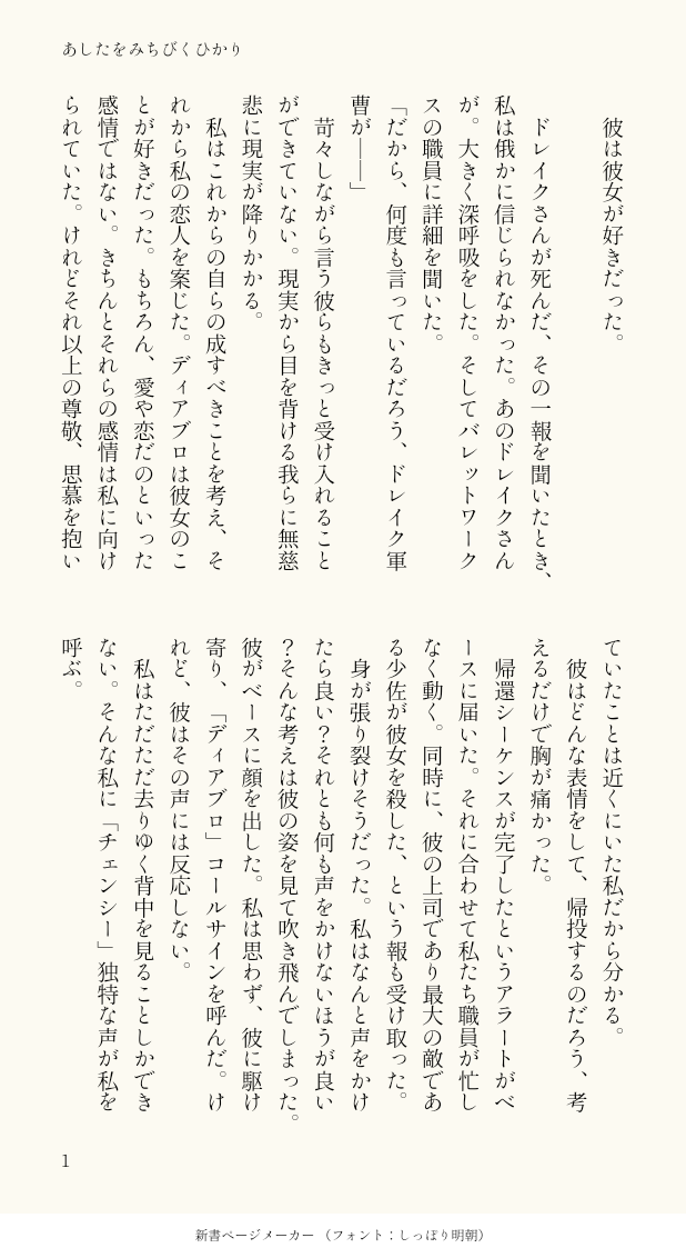 saya_wl☆quiet followDONE[SS]ディアンシー(ディアブロ×チェンシー)+ドレイクあしたをみちびくひかり(1/2)前に書いたチェンショップとドレイクさんのやつのディアンシー版です。ディアンシーだとこうなります。#さやSS幻覚 show all(+4 images) Tap to full screen (size:618x1132).Repost is prohibited Let's send reactions! freqpopularsnackothersPayment processing Replies from the creator Follow creator you care about!☆quiet follow saya_wlDONE[SS] チェンショップビショップさんが好きなチェンシーてゃん#さやSS幻覚 4 saya_wlDONE[SS]知りたい、知りたい、ただ知りたい(1/2)ビショルキ(ビショップ×一般ルーキー)彼らが付き合う話です。ルーキー若干メンヘラですフニャチンイベント後の話です #さやSS幻覚 8 saya_wlDONE[SS]もしかしたらあったかもしれないいくつかのこと(1/2)チェンショップ。ビショップさんがプロポーズします。■■■はビショップさんの本名だと思ってください。#さやSS幻覚 5 saya_wlDONE[SS]ディアンシー ディアブロ×チェンシーディアブロくんが妬く話#さやSS幻覚 2 saya_wlDONE[SS]チェンショップ(1/2)これもまたWebサイトにあげたものです。つき合ってない二人だったが…しほさんのクリスマスイブ夢の続きです#さやSS幻覚 3 saya_wlDONE[SS]チェン+ビショWebサイトにあげたものです。二人はつきあっていません#さやSS幻覚 3 related works saya_wlDONE[SS]ディアンシー社畜チェンシーてゃん#さやSS幻覚 3 saya_wlDONEビショルキ(親子概念)SS。親子概念になるまでの話です。ビショップさんがルーキーを喫茶店に呼んで話をします。 グリルキ、チェンショップ要素あり 10 saya_wlDONE[SS]ジョニモブ自傷をする夢主。登場人物全員ひどいのとジョニ担は若干閲覧注意。#さやSS幻覚 2 saya_wlDONEジョニロットSS。致すまで。ヤってはないので一応全年齢。 6 saya_wlDONE[SS]ペインキラー夢(ペインキラー+モブ)若い女とペインキラー。ペインキラーは「知って」います。#さやSS幻覚 2 saya_wlDONE[SS]チェンショップ永遠に火をつける(1/2)かつての同期と飲みに行ったチェンシーちゃん#さやSS幻覚 6 saya_wlDONE[SS]ジョニー夢(ネームレス主人公)(ネームレスはキャラ名ではない)わかりにくいけど一応ジョニー夢。バレットワークスって有名だし傭兵に勝手に恋するがきんちょいると思うんですよね。#さやSS幻覚 saya_wlDONE[SS]ディアンシー星を見るディアンシー。このシリーズ全ての自カプでやりたい#さやSS幻覚 2 saya_wlDONE[SS]ルキ←ジョニのジョニモブ前提。ルキはシャーロットではありません#さやSS幻覚 recommended works _mori_99TRAININGガロリオ名もないモブが出てきてリオと話をするガロリオいつも使わせてるお題メーカー↓ #今日の二人はなにしてる #shindanmakerhttps://shindanmaker.com/831289 4 すおうDOODLEキンセブのお話は「きっと仕方の無いことなのだ」で始まり「また会えますようにと願うほかないのだ」で終わります。#こんなお話いかがですか #shindanmakershindanmaker.com/804548 かほる(輝海)DONE貴方はかほるさんちの獠で『足して割って、ちょうど』をお題にして140文字SSを書いてください。#shindanmakerhttps://shindanmaker.com/375517原作以上の関係。寒い朝はこんな二人もいいね(*´艸`*) aosabikinakoTRAINING貴方はチア相で『なんて言ったの?』をお題にして140文字SSを書いてください。#shindanmakerhttps://shindanmaker.com/375517 aosabikinakoTRAINING貴方はハル相で『照れ隠しの仕草』をお題にして140文字SSを書いてください。#shindanmakerhttps://shindanmaker.com/375517ほのめかし夜のお話 aosabikinakoTRAINING貴方はハル相で『手繰り寄せた糸の先』をお題にして140文字SSを書いてください。#shindanmakerhttps://shindanmaker.com/375517 憂那(yuu719)TRAINING1時間以内に10RTされたら零がカジュアルな格好で本を読んでいる絵を描いてください。お題が難しいならとりあえず脱がしといてください#shindanmaker #憂那練習loghttps://shindanmaker.com/1180072枚目脱いでるので気を付けて(?)ね 2 saya_wlDONE[SS]チェンショップ 新しい春を掘り起こして(1/3)チェンショップが付き合う話チェンショップが付き合う話は昔に書いたんですけど資料集読んだら考えが変わりました。長くてすまん。誤字あったらすまん#さやSS幻覚 https://t.co/jzwwGKQNJA 9 rlomen_leov2DOODLE診断メーカー様で出たので落書き…!!と〜ふのアルユリのタイトルは『さよなら大好きまた来世』煽り文は『苦しい、だから、頼らせて』です#CP本タイトルと煽り #shindanmakershindanmaker.com/717995