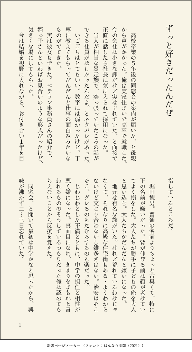 akkkkkkira053☆quiet followDONE『ずっと好きだったんだぜ』SD堀田徳l男×三l井l寿 淡い恋愛ショートストーリー。〇いとうかxxずよし ずっと好きだったへのオマージュ。徳三。キッスもぬるいので全年齢。加筆修正はpixivへhttps://www.pixiv.net/novel/show.php?id=19532883 #二次創作BL secondaryCreationBl #ザファ #小説 novel #徳三 #天上天下三井独尊4 show all(+6 images) Tap to full screen (size:618x1132).Repost is prohibited Let's send reactions! freqpopularsnackothersPayment processing Replies from the creator Follow creator you care about!☆quiet follow akkkkkkira053DONE再上映記念 10/31まで公開鉄三『小籠包食べたい』全年齢付き合ってる未来軸 映画に出ない男が鉄男です。院卒後、選手デビューして間もない鉄三日常回。相変わらず中華を食べに行く。文字バージョンpixivへhttps://www.pixiv.net/users/3916311WAVEBOXhttps://wavebox.me/wave/7ez383h6ndsvzg9c/ 9 akkkkkkira053PAST10/31まで公開予定。グレ三と鉄男の危うい関係がある!と、勢いで書いた短編です。初めて本にした作品でした。思い出深いので、拙いところもありますが楽しんで頂けたら嬉しいです(誤字すごい)本は在庫あります~表紙の用紙と写真の相性がお気に入り。本で手に取りたい方向け。めちゃくちゃ読みやすい分量です(他が大体長いため)https://akira053.booth.pm/items/4700363 25 akkkkkkira053DONE7/13 星に願いを-day2- #三歩進んで超みっちゃく!#天上天下三井独尊オフ『エヴリタイムセイグッバイ』上 約65000字 全年齢180P ¥1,000-大人になった二人が、人生の岐路に立つ「旅」をテーマにした長編の上巻です。※今回は鉄三未満 会話は回想のみ。後半の下は2026鉄三オンリー「鉄は熱いうちに三度打て!」発行予定。イベント後、BOOTH通販予定。 18 akkkkkkira053PAST6/1プロポーズの日の記念に、2024/6/30に頒布したリョ三『After rain comes...』プロポーズの章を再録します。7/13まで。2025/07/13 【星に願いを 2025-day2-】三井寿受 SLAM DUNK(三井寿受オンリー)に既刊として持ち込みます!通販はこちら>https://akira053.booth.pm/items/5874288 15 akkkkkkira053PROGRESS祝!天上天下三井独尊10開催おめでとうございます!鉄三のいつでるか未定ですが、新刊にする予定の下書きをダイジェストで公表します。「旅」をテーマに、大人に向かう二人が通じ合っていく姿を描けたらいいなと始めました。かなり壮大な話になりそうなので、発行時期未定ですがイベント合わせにします。pass 背番号 誕生日なのでパス変えました! 36 akkkkkkira053DONE『RADIO FOR TWO』12/1三井受オンリー新刊発行となりました!A5/60P全年齢600円アメリカから放送するリョの番組を、日本にいる三井が聴きます。偶数ページリョ・奇数ページ三井(本になる形のままなので始まりは2P~)で進行する構成。リョは偶数、三は奇数のページだけ読むとお話がつながっています。この話に加筆、書き下ろしを加えて4部構成です。リョ三の背番号は? 19 related works akkkkkkira053PROGRESShttps://twitter.com/akkkkkkira053/status/1660976856924065792?s=20 の続き。40歳三井が20歳徳男の目の前に現れて致す話。謎の設定、謎の時空です。こつこつ書いていきたいと思います! 4667 akkkkkkira053PROGRESShttps://poipiku.com/7524627/8558165.html のえっちスケッチワンタッチを置いていきます。校正前なのはお許しください。▼徳三 ちゃんとハピエンを目指すけどしばらく片思いが続く▼1996年を18歳として数えて令和まで続く話▼書きあがったら5/4スパコミにて発行予定。(予定)パスは背番号でお願いします!18禁(この春18歳になる4月生まれは閲覧だめです) 1820 akkkkkkira053MOURNINGセルフライナーノーツが好きすぎてあとがきを書かないと死んじゃうので、書きました!サンプル読む前に読むとネタバレになります。全部自分のこだわりです!しらんがな!とかの突っ込みあると思いますがそれでいいです!しらんがなって思ってもらえたら嬉しいです!このお話のあとがきです→https://poipiku.com/7524627/8481989.html 6 akkkkkkira053INFO進捗記録→サンプルに差し替えました!18禁部分あるためPASS制です。満18歳以上の方が閲覧可能です。▼徳三 ちゃんとハピエンを目指すけどしばらく片思いが続く▼1996年を18歳として数えて令和まで続く話。大人になった二人が近づいたり離れたり。▼ちゃんと喋るモブがいっぱい出ます。▼問題なければ5/4スパコミ新刊として並びます。P134¥1200 A6文庫サイズ18歳↑?y/n 16 akkkkkkira053PROGRESS徳三の進捗UPしていきます!!!『ツレに彼女ができたと聞いたら途端に好き自覚して告白した俺の話聞く?』A5サイズ2段組予定 ページ数未定▼徳←三の男子高校生青春の日々。ハピエン。▼三井の引退のお話が絡みます(捏造)▼モブ女子が結構喋ります▼タイトルは三井のことです※つまりタイトルは三井の勘違いの可能性があります※▼全年齢▼2023/8/20スパコミ関西 29 発行予定。 4 akkkkkkira053DONE『ずっと好きだったんだぜ』SD堀田徳l男×三l井l寿 淡い恋愛ショートストーリー。〇いとうかxxずよし ずっと好きだったへのオマージュ。徳三。キッスもぬるいので全年齢。加筆修正はpixivへhttps://www.pixiv.net/novel/show.php?id=19532883 7 akkkkkkira053INFO▼5/4スパコミ