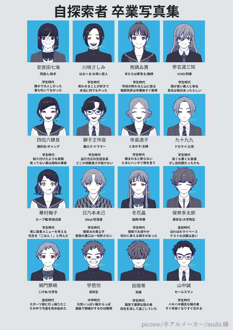 StartedTrpg☆quiet followMEMO自探索者たちの卒業写真アルバムです。大体が中学~高校卒業時のつもりなので、髪型や表情は卓時とは違うものとなります。ネタバレはありません。つくるの楽しかったです。卒アルメーカー/mubi.様https://picrew.me/ja/image_maker/2503027 Tap to full screen (size:1414x2000).Repost is prohibited Let's send reactions! freqpopularsnackothersPayment processing Replies from the creator Follow creator you care about!☆quiet follow StartedTrpgMEMO自探索者たちの卒業写真アルバムです。大体が中学~高校卒業時のつもりなので、髪型や表情は卓時とは違うものとなります。ネタバレはありません。つくるの楽しかったです。卒アルメーカー/mubi.様https://picrew.me/ja/image_maker/2503027 StartedTrpgMOURNING亜坂さんイメージアクセサリーです。作りながら変わりますが、基本的にはこんな形です。あと部品もたまに気分的に変えることも…あったりなかったり…。2枚目は、非公開NPCイメージです。 2 StartedTrpgSPOILER町葬屋怪異譚 げんみ❌各陣ごとのチーフイメージで、KPの趣味で数パターンのチャームを作りました。チーフ別に、例の事件で拾われた部分は違うと思い、色々なパターンを作ってみました。下のタッセルを縛っている色は、チーフの髪色です。 StartedTrpgSPOILER※注意※非公式の漫画化幻覚素材を拝借したものです。問題があった場合削除いたします。特にネタバレはありません。 5 StartedTrpgMOURNING町葬屋1陣の名刺イメージです。ロゴは、チーフ自作のものを拝借しました。ありがとうございます。 4 StartedTrpgSPOILER