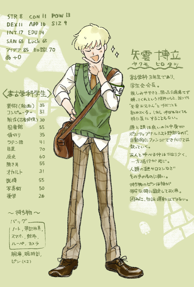 koga_hrt88☆quiet followDONECoC:矢雲 博立(ヤクモ ヒロタツ)21歳。考古学科大学3年生。学生会会長。顔が良くやかましいポジティブナルシスト野郎。誰彼構わず真っ先に「俺のことは親みを込めて、矢雲博立と呼んでくれ!」と言ってくる。システムに左右されない運命力が常におかしい。どうしてこんなに伝説を生んでしまうのか。 show all(+10 images) Tap to full screen (size:1378x2039).Repost is prohibited Let's send reactions! freqpopularsnackothersPayment processing Replies from the creator Follow creator you care about!☆quiet follow koga_hrt88DONECoC:Nicolas El Boulogne(ニコラ・エル・ブローニュ)【愛罠蜂】HO1:ベーカリーオーナー※ネタバレなし。48歳。フランス人。温和。ゆるい。クラシック好き。店名は「Berceuse (ベルスーズ)」ショパンの”子守唄”より。全体的に芸術性に拘っており、普段はうさぎの被りものをして接客し、オリジナリティ高めのお菓子を作る。商品名がどれも人名のタイプのお店。 3 koga_hrt88DONECoC:奄美 雪斗(アマミ ユキト)【猫カフェ行ったら猫耳生えた】あの奄美の弟。見た目からは少し逸れて人一倍真面目な大学院生。秀才タイプ。猫と星好き。奄美兄のことは「兄さん」、素でたまに「兄貴」呼び。進学も院生になれたのも大きく兄のおかげで、日頃の感謝含め慕っているが、ちょっと素直になり難い。今は目の前のことに励んでいつか返すつもり。ただ、外で自分の話、いたたまれないから控えてほしい。 16 koga_hrt88DONEエモクロア:Adler G Vinter(アドラー・ヴィンター)【ウルトラヒロイック】HO4:世界最強の魔法使い。(星)※ネタバレなし。紅茶と星好き。ハックルベリーのパイも焼く。個人的に星空の研究を進めている。腰羽はある程度個別で動き、時たま叩いてくるので口論(?)になる。極夜と好きな頭蓋骨を被るデュラハン、ふんわり「よだかの星」モチーフ。角の一部がデンドリックアゲート。 13 koga_hrt88DONECoC:辻本 景(ツジモト カゲ)レンタルビデオ店員。27歳。STR4。(参考にはならない)【区区】HO2:紙袋。※ネタバレなし。足癖の悪い省エネ特化型ダウナー系。すぐ死線が見える。もっとつっけんどんかと思ってたら、もうその体力が勿体無いらしく「まあ死ななきゃいんじゃねーの…?」ってなりがち。映画とゲームとスニッカーズ好き。嗅ぎ煙草(SNUFF)派。デザはシナミズトカゲ意識。 11 koga_hrt88DONECoC:神田 角成(コウダ スミナリ)【唸れ!暁コメディーショー】HO2/ボケ※ネタバレなし。コント師「ナンチャンカンチャン」のボケ。23歳。11歳差年の差コンビ。相方は南田(みなみだ)なので"なんだかんだ"に「南田だ」「神田です」の自己紹介天丼ネタ持ち。我が強め且つドライめ。でも相方のケイさん(APP16)には強火。自分はAPP15。ドーナツ好き。煙草の銘柄はハイライト。 24 koga_hrt88DONECoC:鳶坂 志保(トビサカ モトヤ)警視庁刑事部捜査第一課所属の刑事。【プルガトリウムの夜】:HO2※ネタバレなし。事件を着実に減らし人々を救える、そう希望を抱いて刑事になった。しかし今は、結局は組織の見栄や性質が優先事項でついてまわる、そんな警察という組織がどちらかというと嫌いである。初見だと「志保(しほ)」って呼ばれがち。煙草の銘柄はウィンストン。 17 recommended works 莉子/りしDOODLE多分着替えなさそうだけど、二次創作だからいいじゃない‼️やたら着なれてる感あって105ちゃんドキドキすればいいと思う(無自覚)23/07/28 RR_DONE🍑 2 もなかDONE【童シオ】相互様のお誕生日に贈った絵です。2人の強い絆が好き❤️消えゆくシオン様にそっと涙する童虎に胸がギュッとなる… screamwandererPROGRESS gogo_gochaDONE🐶🐱オクバデの夜中のわんにゃん(R18)待てが出来ないオクわんこくん※ケモ、ショタ、肌色※ 18歳以上(高校卒業済み)の方のみ閲覧できます2枚目は文字なしの絵です。pass:18↑?(y/n) 2 はらはらりPROGRESS新年絵うぃぷもう2024年半月もないってマジですか???? FairySnowmusicDONEメイドTS🐉立ち絵できました!! 2 もほろびちーずDOODLE噛み噛み 藤村ありとMEMOレイマシュ☔️🍄ふうふ小話2が出来ました(^^)v読んでいただけると嬉しいです。 1593