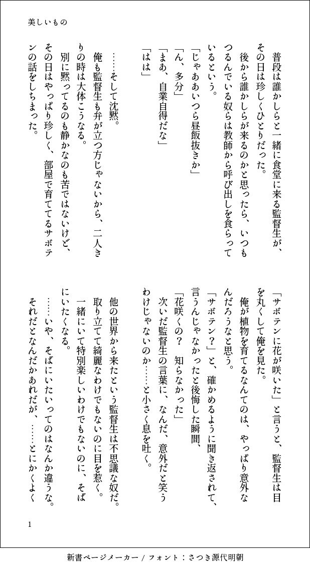 さきぴ☆quiet followDONEジャク→監♂短編「美しいもの」かわいいと思っている、自覚はまだなく ##ジャク監短編 show all(+2 images) Tap to full screen (size:618x1132).Repost is prohibited Let's send reactions! freqpopularsnackothersPayment processing Replies from the creator Follow creator you care about!☆quiet follow さきぴDONEジェ→監♂→フロ短編「祈り」自分の気持ちが何かを知らないジェの字が、監♂をフロくんに近づけたくない一心で傷つける話 10 さきぴDONEジェ監♂短編「Suger」人間への興味から始めた関係に、勝手に溺れて死にかけるジェの字 9 さきぴDONEジェ監♂短編「明日を知らない」どうしたっていいよという雰囲気を出しつつ、どこにもいけないように、約束と体とで縛りつけるなどする 8 さきぴDONEジェ監♂短編「運命の人」「夜を駆ける」の監♂視点、まだ何の別れも知らない幸せな子ども 12 さきぴDONEジェ監♂短編「夜を駆ける」兄弟のために身を引くと決めた最後の夜の話 11 さきぴDONEジェ→監♂→フロ「エンドゲーム」監♂に片思いしているジェがフロのふりをして監♂と付き合い出すいずれ終わる関係の話 13