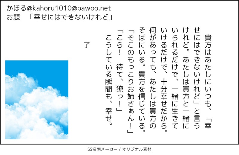 貴方はかほるさんちの香ちゃんで『幸せにはできないけれど』をお題にして140文字SSを書いてください。