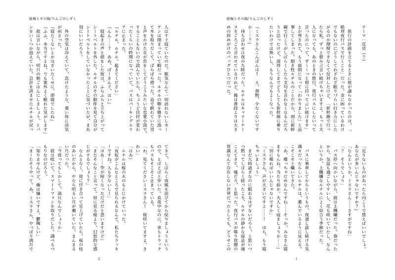 りんごのしずく☆quiet followDONE『後悔とその指』ペーパーラリーのものです。フォル学軸のミスルチで、夜行バスに乗って旅行に行く短い話です。セブンイレブン:PAKGKDP8ローソン・ファミリーマート:KBRL2GBRWA show all(+1 images) Tap to full screen (size:7104x5040).Repost is prohibited Let's send reactions! freqpopularsnackothersPayment processing Replies from the creator Follow creator you care about!☆quiet follow りんごのしずくDONEミスルチ利き小説にて掲載していたSSです。お読みくださりありがとうございました! 2065 りんごのしずくDONE肉体的に惹かれ合うふたり、という感じです。⚠️オーエンがカインに仮死魔法をかけます。 5727 りんごのしずくDONE忘れたって何度でも! 展示物開催おめでとうございます!🎉『毒入りチョコレート事件』はじまりそうなオーカイ小説です。騎士である前に魔法使いであるカインに想いを馳せてます。再掲SS 『侵食』『疼く情性は名を持たず』 17498 りんごのしずくPASTTwitterやミルパでアップしていたミスルチのまとめです。来年もたくさん書けるといいなー。 23896 りんごのしずくDONE『これ以上「E」を与えないで』ミルパ開催おめでとうございます🎉Eっていうのはえ母音のことを言ってて、懇願のえ母音です。ミスラが恋を自覚する話です。自覚せずに済むとでも思ったか? と思ったので……(?) 10318 りんごのしずくDONE『後悔とその指』ペーパーラリーのものです。フォル学軸のミスルチで、夜行バスに乗って旅行に行く短い話です。セブンイレブン:PAKGKDP8ローソン・ファミリーマート:KBRL2GBRWA 2 recommended works すすすTRAINING髪も服も難しい shabushabu_mhykPAST消したもの再揭 7 ともりDONE【ミスルチ】ミスラさんお誕生日おめでとう 5 niu_illuminatorPROGRESSミルパのペーパーラリー用のミスルチはこんな感じの話になった 青衣DONE3/28ミルパで展示していた漫画です。 6 shiro4_27DOODLE単にすけべな絵が描きたかったと言っており 2 maru1216picDONEルチル 2 amkchan_DONEオカ応援会2開催おめでとうございます!まだオーカイの二次創作の方向性が定まっておりませんがとりあえず通過儀礼です。温かい目で見ていただけると幸いです。(2022/8/29追記)8/28縁バカ2で頒布したCurse word to youに少し修正したもの(pixivに掲載済み)を再録しています。 4 _papapa_pan_DONEカインがオーエンに治癒魔法をする話(オーカイ)治癒魔法は捏造注意 11
