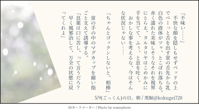 黒鯨720☆quiet followDONE5/9(ごっくん)の日、朝 Tap to full screen (size:960x540).Repost is prohibited Let's send reactions! freqpopularsnackothersPayment processing Replies from the creator Follow creator you care about!☆quiet follow 黒鯨720MAIKING供養のつもりでXに上げたものそのうち続きを書いて支部行きにしたい 4636 黒鯨720DONEタル×蛍へのお題は『だったら捕まえてごらん?』です。たまには140字じゃ無くshindanmaker.com/392860 黒鯨720DONE貴方はタル×蛍で『裏切り、ごめん』をお題にして140文字SSを書いてください。shindanmaker.com/587150──もう少し、時間稼ぎしてもらう予定だったんだけどなぁ 黒鯨720DONEタル×蛍へのお題は『最初からやり直したい関係』です。shindanmaker.com/392860 黒鯨720DONE貴方は邪タル×蛍で『お代はキスでいいよ』をお題にして140文字SSを書いてください。shindanmaker.com/587150 黒鯨720DONE貴方はタル×蛍で『寝惚けてた、寝惚けてたんです!』をお題にして140文字SSを書いてください。shindanmaker.com/587150 recommended works すおうDOODLEヴィンセントとユフィのお話は「好きって言ったら怒る?」という台詞で始まり「腹が立ったから、脇腹をつついてやった」で終わります。#こんなお話いかがですか #shindanmakershindanmaker.com/804548 甘味料TRAINING12月21日『刀剣男士誰描くアンケったー』より1票を勝ち取った兼さん aosabikinakoTRAINING貴方はチア相で『ちょっと黙って』をお題にして140文字SSを書いてください。#shindanmakerhttps://shindanmaker.com/375517 かほる(輝海)DONEシティーハンター冴羽獠×槇村香原作以上の関係あなたはかほるさんちのRで【包み込むように / 手加減はしませんよ】をお題にして140字SSを書いてください。#shindanmakerhttps://shindanmaker.com/780366この煽り方は一番ヤバいやつ😂 148 おいなりさんDOODLEおいなりさんとこの真珠くんとカスミさんの場合:桜の花に見とれてる相手の腕を引いてこちらを振り向かせて、ひとり占めしたいと指を絡めました。#ほのぼのなふたり #shindanmakerhttps://shindanmaker.com/715149これ以上は無理だなと思ったのでここまで。 3 かほる(輝海)DONE逆転裁判成歩堂龍一×綾里真宵4で完全恋人設定。あなたはかほるさんちのナルマヨで【さみしさを愛と呼ぶ / ただならぬ関係】をお題にして140字SSを書いてください。#shindanmakerhttps://shindanmaker.com/780366久しぶりにナルマヨ(*´ω`*) 147 jejeCH4TRAINING貴方はJeJeんちの獠香で『どこかで響いた銃声』をお題にして140文字SSを書いてください。#shindanmakerhttps://shindanmaker.com/375517 647 titose0401hDONE貴方は洋花で『縁のない』をお題にして140文字SSを書いてください。#shindanmaker縁のない話って、難しい😭 もくまおう@mokuma_ohDONE貴方は巌ふち@もくまおうで『指切り』をお題にして140文字SSを書いてください。#shindanmakerhttps://shindanmaker.com/37551720230703pass予定調和な140字over※原作96話後(アニメではまだやってない)の妄想巌視点での短文(独白)もうちょっと掘り下げたい話 2