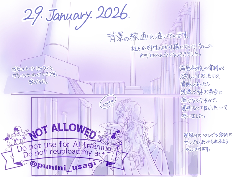 punini_usagi☆こそフォロ作業進捗2026/1/29〜1/31背景の線画を描いていました。そして星祭り前日に線画しか描けてないサンプルをアップしたとゆう…。当初予定では星祭り前日には本になって手元にあったはず。それが無理ぽいと思った次の予定では星祭り当日に入稿できるようなってたはず。目論見が甘すぎる。自分なら描けるはずという根拠のない自信が無謀な計画を立てたんだな…反省。 すべて表示(+2枚) タップで全画面(原寸:2000x1500)無断転載禁止 リアクションをたくさん送って応援しよう! よく使う人気おやつその他支払処理中 作者からのリプライ 気になる人をどんどんフォローしよう!☆こそフォロ punini_usagi作業進捗2026/2/15〜2/18やっと完成したので入稿しました!当初予定から遅れること1ヶ月!そうだよ初めは1/20あたりに入稿するつもりだったのに…自分の描く速度を過信し過ぎていた。でもなんとか終わりました〜!11/20から作業始めたから、約3ヶ月かかってる…時間かかり過ぎぃぃ。。。 3 punini_usagi作業進捗2026/2/1〜2/11星祭り当日もがんばって原稿描いてました…お花型のサンゴの自分用素材作ったりして。あと、どうにも描き難いと思ってたらiPadの保護シートぼろぼろだったので張り替えました。 5 punini_usagi作業進捗2026/1/29〜1/31背景の線画を描いていました。そして星祭り前日に線画しか描けてないサンプルをアップしたとゆう…。当初予定では星祭り前日には本になって手元にあったはず。それが無理ぽいと思った次の予定では星祭り当日に入稿できるようなってたはず。目論見が甘すぎる。自分なら描けるはずという根拠のない自信が無謀な計画を立てたんだな…反省。 3 punini_usagi作業進捗2026/1/26イオバイ本が間に合わないの確定で心が落ち着かなくなったので、落ち着いて原稿に取り組むため星祭り頒布用にぬいちゃん写真集を作りました。1日で編集して入稿した。気分転換にもなってよかった。 2 punini_usagi作業進捗2026/1/17〜1/22表紙を描いて、奥付ページ描いて、とりあえず全頁線画とフォントは入ってるのでこのまま本にしちゃう?とか言い始めた頃。仕事も忙しかったのに天気悪くて頭痛に悩まされていた…こうゆー外因もあるってことを考えに入れて予定立てなきゃいけませんね。 5 punini_usagi作業進捗2026/1/9~1/15人物部分のペン入れをがんばっていました。鱗衣のペン入れが大変だと言いながら、裸のページにも時間かかっとるやんけ。星祭りまであと2週間なのに、その2週間で表紙と背景と仕上げを終わらせられると思ってる…甘い。甘いわ!! 6