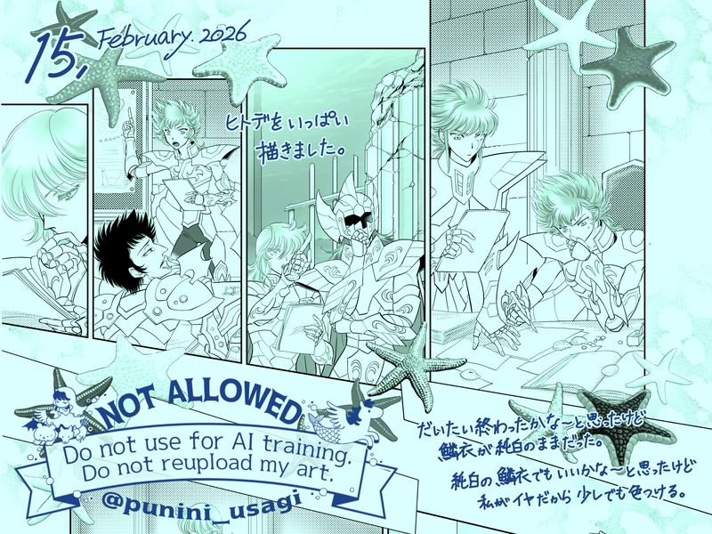 punini_usagi☆こそフォロ作業進捗2026/2/15〜2/18やっと完成したので入稿しました!当初予定から遅れること1ヶ月!そうだよ初めは1/20あたりに入稿するつもりだったのに…自分の描く速度を過信し過ぎていた。でもなんとか終わりました〜!11/20から作業始めたから、約3ヶ月かかってる…時間かかり過ぎぃぃ。。。 すべて表示(+2枚) タップで全画面(原寸:2000x1500)無断転載禁止 リアクションをたくさん送って応援しよう! よく使う人気おやつその他支払処理中 作者からのリプライ 気になる人をどんどんフォローしよう!☆こそフォロ punini_usagi作業進捗2026/2/15〜2/18やっと完成したので入稿しました!当初予定から遅れること1ヶ月!そうだよ初めは1/20あたりに入稿するつもりだったのに…自分の描く速度を過信し過ぎていた。でもなんとか終わりました〜!11/20から作業始めたから、約3ヶ月かかってる…時間かかり過ぎぃぃ。。。 3 punini_usagi作業進捗2026/2/1〜2/11星祭り当日もがんばって原稿描いてました…お花型のサンゴの自分用素材作ったりして。あと、どうにも描き難いと思ってたらiPadの保護シートぼろぼろだったので張り替えました。 5 punini_usagi作業進捗2026/1/29〜1/31背景の線画を描いていました。そして星祭り前日に線画しか描けてないサンプルをアップしたとゆう…。当初予定では星祭り前日には本になって手元にあったはず。それが無理ぽいと思った次の予定では星祭り当日に入稿できるようなってたはず。目論見が甘すぎる。自分なら描けるはずという根拠のない自信が無謀な計画を立てたんだな…反省。 3 punini_usagi作業進捗2026/1/26イオバイ本が間に合わないの確定で心が落ち着かなくなったので、落ち着いて原稿に取り組むため星祭り頒布用にぬいちゃん写真集を作りました。1日で編集して入稿した。気分転換にもなってよかった。 2 punini_usagi作業進捗2026/1/17〜1/22表紙を描いて、奥付ページ描いて、とりあえず全頁線画とフォントは入ってるのでこのまま本にしちゃう?とか言い始めた頃。仕事も忙しかったのに天気悪くて頭痛に悩まされていた…こうゆー外因もあるってことを考えに入れて予定立てなきゃいけませんね。 5 punini_usagi作業進捗2026/1/9~1/15人物部分のペン入れをがんばっていました。鱗衣のペン入れが大変だと言いながら、裸のページにも時間かかっとるやんけ。星祭りまであと2週間なのに、その2週間で表紙と背景と仕上げを終わらせられると思ってる…甘い。甘いわ!! 6