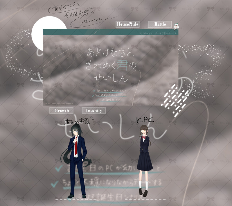 itokinako☆quiet followMEMOCoC「あどけなさと、ざわめく君のせいしん」KP:七伏 五鈴様PC/PL鷸懿 繆纋(いちい るう)/わたし繆虁 縒龓篦(りょうぎ しゅうの)/KPCエンドAにてシナリオ終幕です楽しかった~!かわいかった~♡お誕生日お祝いしてもらちゃった~~(PCが) #糸奇卓日記 Tap to full screen (size:3000x2662).Repost is prohibited Let's send reactions! freqpopularsnackothersPayment processing Replies from the creator Follow creator you care about!☆quiet follow itokinakoMEMOCoC「ウィルマゼア急行の一番長い運行記録」KP:陽月様PC/PL(敬称略)Anastasia・Flory/雪❄さんIrving・Aldrich/はくさいさんAaliyah ・C・Passionbell /わたし全生還にてシナリオ終幕です(*'▽')♪本当に長い長い旅程でしたが、その分いっぱい楽しめました♡ itokinakoMEMOクトゥルフ神話TRPG 「胡桃炸裂症候群 -Drosselmeyer Syndrome-」作者:あお(キメオール)様KP:糸奇 菜狐PC/PL(敬称略) HO公安:沖津 海吏/ちわHO刑事:沖津 海吏/もぐりEND-Dにてシナリオ終幕です(*'▽')♪♪終始ニコニコの、同姓同名バディのKPを無事勤め上げました! お二人の掛け合いがとってもよかったの~♡ itokinakoMEMOクトゥルフ神話TRPG「鏡の国とアリス」作者:シュガーリア(砂糖院製作所)様KP:わたしPC/PL(敬称略)漆雜 俐烏涅/七伏 五鈴月瀬古 照里/かにエンドBにてシナリオ終幕です(*'▽')♪久しぶりの"てえてえ"を全身で浴びれてハピネスです♡ 2 itokinakoMEMOCoC「探索者(FBI)格付けチェック」KP:レント様PC/PL(敬称略)Eric・Chen/ふわ小雨Rio・Kashima/ふわ小雨Gray・L・Burnet/陽月Elenore・Kitty・Lillian/雪❄Laffey・G・Petrosinella/わたしThalia・Anderson(友情出演)/めいHoward・Bell/KPCKay・Lopez/柴プードル itokinakoMEMOCoC「Paranormal crime-DLC」KP:めい様PC/PL(敬称略)HO1:Rio・Kashima/ふわ小雨HO2:Gray・L・Burnet/陽月HO3:Elenore・Kitty・Lillian/雪❄HO4:Laffey・G・Petrosinella/わたしHO5:Howard・Bell/レントHO6:Kay・Lopez/柴プードル全生還にてシナリオ終幕です itokinakoMEMOCoC「BREAD AND BUTTER」作者:大点(INU)様/犬点書店KP:しなもん様PC/PL(敬称略)HO1:朱渼 薶㗨/七伏 五鈴HO2:見牌楼 祾百/わたしEND-B 両生還にてシナリオ終幕です(*'▽')♪事前に言われてたけど、すんごい内容の濃厚なシナリオだった!回してくれたKPも、一緒に回ってくれた相方も大好き♡ related works itokinakoMEMOCoC「花葬標本」作者:染井悉 様KP:わたしPC/PL(敬称略)藤 大和/キリサキ片喰 輝星/KPCEND-カソウ にてシナリオ終幕です(*'▽')♪正義感あふれる、とても誠実で頼りになるお方でした!いい先輩を持ててよかったね、きららちゃん♡ itokinakoMEMOCoC「Neugierig Partner(のいぱる)」KP:いぬみや様PC/PL(敬称略)HO探偵:明星 ケイト/鹿猫HO助手:蛇㞢媛 䔽嫷/わたし両生還にてシナリオ終幕です♡先週に引き続き楽しくセッションができました~♡ 相方のケイトちゃん、HOにポンコツとあるのに、すっごく出目がえらいんですが??? itokinakoMEMOCoC「稲妻のように燃えて寄せ」作者:結井ななきそ様(左に右折)KP:糸奇 菜狐PC/PL(敬称略)Myriatti・Leligiel・Diena/七伏 五鈴柳井 紬/ののノののエンドA にてシナリオ終幕です(*'▽')♪とっても仲良しなアイドルのお二人、手と手を取り合ってほほえましかったですね~~~♡ itokinakoMEMOCoC「Paranormal crime」KP:めい様PC/PL(敬称略)HO1:Eric・Chen/ふわ小雨HO2:Gray・L・Burnet/陽月HO3:Elenore・Kitty・Lillian/雪❄HO4:Laffey・G・Petrosinella/わたしHO5:Howard・Bell/レントHO6:Kay・Lee/柴プードル第二話、探索者全生還にてシナリオ終幕です( itokinakoMEMOCoC「サンドリヨンと崩壊の夢」KP:悩みの種様PC/PL(敬称略)HO1:祈る者 繭入 歌凪/わたしHO2:救う者 南雲 遊星/新屋敷 真紅HO3:導く者 増田 大和/たましいHO4:願う者 蘇芳 六花/しろEND4 にてシナリオ終幕です(*'▽')終始、ドキドキが止まらなかったなぁ~♪♪♪♪ itokinakoMEMOCoC「くれいびんぐふぉーゆあぶらっど!」KP:新屋敷 真紅様PC:繭入 歌凪KPC:南雲 遊星エンドA にてシナリオ終幕です(*'▽')♪昨日終えたばかりの二人で遊んできました✨もっと仲良しになれました~♡ 2 itokinakoMEMOCoC「Lustig Partner」KP:いぬみや様PC/PL(敬称略)HO探偵:明星 ケイト/鹿猫HO助手:蛇㞢媛 䔽嫷/わたし両生還にてシナリオ終幕です♡ギャル女子高生探偵と夜のお姉さんっぽい助手の二人で、楽しく事件解決へと向かうことができました~~~(*'▽')♪♪ itokinakoMEMOCoC「Princess Hugging Race!!!」KP:七伏 五鈴様PC/PL鷸懿 繆纋/わたし繆虁 縒龓篦/KPCEND1 にてシナリオ終幕です(*'▽')♪デートした♡ いっぱい遊んだ~♡やっぱりこの二人はかわいいねぇ(✽´ཫ`✽) 2 itokinakoMEMOCoC「探索者(FBI)格付けチェック」KP:レント様PC/PL(敬称略)Eric・Chen/ふわ小雨Rio・Kashima/ふわ小雨Gray・L・Burnet/陽月Elenore・Kitty・Lillian/雪❄Laffey・G・Petrosinella/わたしThalia・Anderson(友情出演)/めいHoward・Bell/KPCKay・Lopez/柴プードル recommended works むーんDONE9周年の文字なしと線画背景をぽちぽちぺたぺた塗ってるときも楽しかったです!てきとーだけど笑8周年のピンク!て感じも好きだけど9周年の青系の色味もとても好き 2 ynm@裏垢DOODLE1/12🆕 後ろ2枚追加しました😂クリスマスもお正月もハッピーホリデーも終わったんですけど、かわいいのでずっと描いてました😍よければ見てい