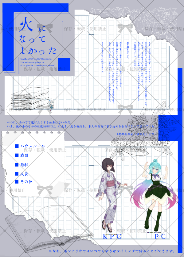 itokinako☆quiet followMEMOCoC「灰になってよかった」KP:雪❄様PC/PL(敬称略)薔薇上 瀏遊帆(ばらがみ るゆほ)/わたし茅蜩 花雨(ひぐらし かさめ)/KPCEND3 にてシナリオ終幕です(*'▽')♪この子、動きやすいし扱いやすいし、ぜひ継続に連れまわしたいですねぇ♡ #糸奇卓日記 Tap to full screen (size:599x833).Repost is prohibited Let's send reactions! freqpopularsnackothersPayment processing Replies from the creator Follow creator you care about!☆quiet follow itokinakoMEMOCoC「ウィルマゼア急行の一番長い運行記録」KP:陽月様PC/PL(敬称略)Anastasia・Flory/雪❄さんIrving・Aldrich/はくさいさんAaliyah ・C・Passionbell /わたし全生還にてシナリオ終幕です(*'▽')♪本当に長い長い旅程でしたが、その分いっぱい楽しめました♡ itokinakoMEMOクトゥルフ神話TRPG 「胡桃炸裂症候群 -Drosselmeyer Syndrome-」作者:あお(キメオール)様KP:糸奇 菜狐PC/PL(敬称略) HO公安:沖津 海吏/ちわHO刑事:沖津 海吏/もぐりEND-Dにてシナリオ終幕です(*'▽')♪♪終始ニコニコの、同姓同名バディのKPを無事勤め上げました! お二人の掛け合いがとってもよかったの~♡ itokinakoMEMOクトゥルフ神話TRPG「鏡の国とアリス」作者:シュガーリア(砂糖院製作所)様KP:わたしPC/PL(敬称略)漆雜 俐烏涅/七伏 五鈴月瀬古 照里/かにエンドBにてシナリオ終幕です(*'▽')♪久しぶりの"てえてえ"を全身で浴びれてハピネスです♡ 2 itokinakoMEMOCoC「探索者(FBI)格付けチェック」KP:レント様PC/PL(敬称略)Eric・Chen/ふわ小雨Rio・Kashima/ふわ小雨Gray・L・Burnet/陽月Elenore・Kitty・Lillian/雪❄Laffey・G・Petrosinella/わたしThalia・Anderson(友情出演)/めいHoward・Bell/KPCKay・Lopez/柴プードル itokinakoMEMOCoC「Paranormal crime-DLC」KP:めい様PC/PL(敬称略)HO1:Rio・Kashima/ふわ小雨HO2:Gray・L・Burnet/陽月HO3:Elenore・Kitty・Lillian/雪❄HO4:Laffey・G・Petrosinella/わたしHO5:Howard・Bell/レントHO6:Kay・Lopez/柴プードル全生還にてシナリオ終幕です itokinakoMEMOCoC「BREAD AND BUTTER」作者:大点(INU)様/犬点書店KP:しなもん様PC/PL(敬称略)HO1:朱渼 薶㗨/七伏 五鈴HO2:見牌楼 祾百/わたしEND-B 両生還にてシナリオ終幕です(*'▽')♪事前に言われてたけど、すんごい内容の濃厚なシナリオだった!回してくれたKPも、一緒に回ってくれた相方も大好き♡ related works itokinakoMEMOCoC「Lustig Partner」KP:いぬみや様PC/PL(敬称略)HO探偵:明星 ケイト/鹿猫HO助手:蛇㞢媛 䔽嫷/わたし両生還にてシナリオ終幕です♡ギャル女子高生探偵と夜のお姉さんっぽい助手の二人で、楽しく事件解決へと向かうことができました~~~(*'▽')♪♪ itokinakoMEMOCoC「くれいびんぐふぉーゆあぶらっど!」KP:新屋敷 真紅様PC:繭入 歌凪KPC:南雲 遊星エンドA にてシナリオ終幕です(*'▽')♪昨日終えたばかりの二人で遊んできました✨もっと仲良しになれました~♡ 2 itokinakoMEMOCoC「Neugierig Partner(のいぱる)」KP:いぬみや様PC/PL(敬称略)HO探偵:明星 ケイト/鹿猫HO助手:蛇㞢媛 䔽嫷/わたし両生還にてシナリオ終幕です♡先週に引き続き楽しくセッションができました~♡ 相方のケイトちゃん、HOにポンコツとあるのに、すっごく出目がえらいんですが??? itokinakoMEMOCoC「探索者(FBI)格付けチェック」KP:レント様PC/PL(敬称略)Eric・Chen/ふわ小雨Rio・Kashima/ふわ小雨Gray・L・Burnet/陽月Elenore・Kitty・Lillian/雪❄Laffey・G・Petrosinella/わたしThalia・Anderson(友情出演)/めいHoward・Bell/KPCKay・Lopez/柴プードル itokinakoMEMOCoC「花葬標本」作者:染井悉 様KP:わたしPC/PL(敬称略)藤 大和/キリサキ片喰 輝星/KPCEND-カソウ にてシナリオ終幕です(*'▽')♪正義感あふれる、とても誠実で頼りになるお方でした!いい先輩を持ててよかったね、きららちゃん♡ itokinakoMEMOCoC「サンドリヨンと崩壊の夢」KP:悩みの種様PC/PL(敬称略)HO1:祈る者 繭入 歌凪/わたしHO2:救う者 南雲 遊星/新屋敷 真紅HO3:導く者 増田 大和/たましいHO4:願う者 蘇芳 六花/しろEND4 にてシナリオ終幕です(*'▽')終始、ドキドキが止まらなかったなぁ~♪♪♪♪ itokinakoMEMOCoC「Princess Hugging Race!!!」KP:七伏 五鈴様PC/PL鷸懿 繆纋/わたし繆虁 縒龓篦/KPCEND1 にてシナリオ終幕です(*'▽')♪デートした♡ いっぱい遊んだ~♡やっぱりこの二人はかわいいねぇ(✽´ཫ`✽) 2 itokinakoMEMOCoC「Paranormal crime」KP:めい様PC/PL(敬称略)HO1:Eric・Chen/ふわ小雨HO2:Gray・L・Burnet/陽月HO3:Elenore・Kitty・Lillian/雪❄HO4:Laffey・G・Petrosinella/わたしHO5:Howard・Bell/レントHO6:Kay・Lee/柴プードル第二話、探索者全生還にてシナリオ終幕です( itokinakoMEMOCoC「稲妻のように燃えて寄せ」作者:結井ななきそ様(左に右折)KP:糸奇 菜狐PC/PL(敬称略)Myriatti・Leligiel・Diena/七伏 五鈴柳井 紬/ののノののエンドA にてシナリオ終幕です(*'▽')♪とっても仲良しなアイドルのお二人、手と手を取り合ってほほえましかったですね~~~♡
