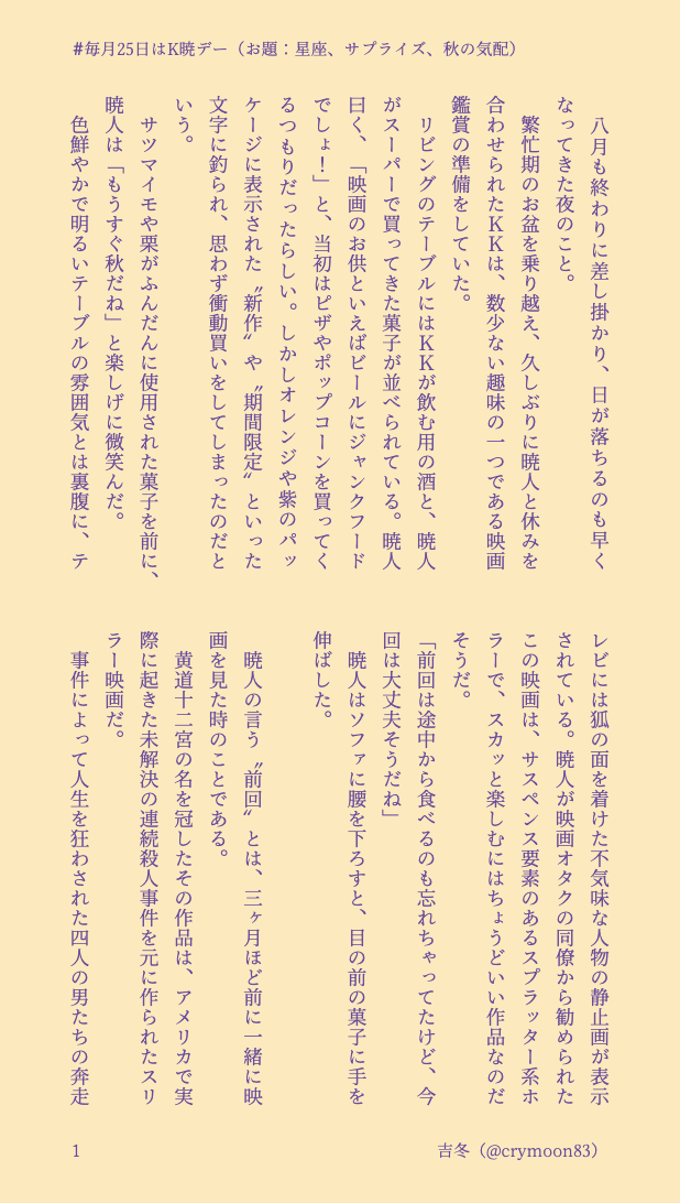 吉冬⛩☆quiet followDONE #毎月25日はK暁デーお題:星座、サプライズ、秋の気配カウチポテトでいちゃつくけあき。分かる人には分かる映画の話。 #K暁 #毎月25日はK暁デー show all(+2 images) Tap to full screen (size:618x1092).Repost is prohibited Let's send reactions! freqpopularsnackothersPayment processing Replies from the creator Follow creator you care about!☆quiet follow 吉冬⛩DONE #毎月25日はK暁デーお題:台風、○○の秋、長袖何でも口実にするけけおじと、結局絆されるあきとくんです。 2 吉冬⛩DONE #毎月25日はK暁デーお題:秋雨、ハッピーバースデー心配性のあきとくん(27)の誕生日の話です。 3 吉冬⛩DONE #毎月25日はK暁デーお題:休日、身支度、デートカレンダー企画に提出した話の、あおきとくん視点です。 3 吉冬⛩DONE #毎月25日はK暁デーお題:星に願いを、湿度、冷房田舎住みゆえ、通勤ラッシュの恐ろしさは想像もつきません。 2 吉冬⛩DONE #毎月25日はK暁デーお題:夏支度、雨模様、ビール何だかんだ言いつつけけおじに甘いあきとくんと、そんなあきとくんが可愛くてしゃーないけけおじが好物です。 2 吉冬⛩DONE #毎月25日はK暁デーお題:洗濯日和、端午の節句、連休三歩進んで二歩下がるけけおじと、それを見守るあきとくんの話です。 3 related works subaccount3210DONE #毎月25日はK暁デー【秋雨】【ハッピーバースデー】【花火】2025年8月急に閃いて書いたので上手く書けていないかもしれないので雰囲気だけ読んでいただけたら幸いです。 1831 柑橘🍊DONE9月のK暁デーでお題は「彼岸花」で書かせていただきました!個人的に彼岸花は好きです! 1646 pasono_riDONEK暁 #毎月25日はK暁デー 「願い事」「ジューンブライド」で失礼致します 2 subaccount3210DONE #毎月25日はK暁デー【ジューンブライド】【ボーナス】【願い事】※純度100%けあきです!!!※ナチュラルに全員生きています 2125 臓物(GwT)DONE #毎月25日はK暁デー9月のお題「彼岸花」で参加させていただきました!(※Twitterに上げていたものと同じ内容です) 6 ことざきDONE24年5月の、#毎月25日はK暁デー に参加させていただきました。お題は『傘』『真夏日』『ネクタイ』。プレゼントしあうK暁です。 6413 吉冬⛩DONE #毎月25日はK暁デーお題:彼岸花、徒競走けけおじの色んな面が好きなあきとくんの話。名有りのモブ依頼人が登場します。 7 吉冬⛩DONE #毎月25日はK暁デーお題:ジューンブライド、ボーナス、願い事うちのけあきは過去を繰り返さないよう、お互いが自分の気持ちを伝える努力をちゃんとしてますよ、という話。 3 085TRAINING #毎月25日はK暁デー より『ジューンブライド』 6 recommended works _hinon_CAN’T MAKEKKにとろっとろにされて気持ちよくなちゃう暁人くんの話R-18 K暁※♡喘ぎしてまっせ※ほんの少しだけお漏らし表現ありご注意pw/🏍️のナンバー 465 asamaruiroDONE 1838 na2me84DONEK暁ワンライ企画に参加させて頂きました。宜しくお願いいたします。 1328 とン@仮置き場MOURNING25日はK暁デーと初めて知ったので。初参加します。素敵な企画!ありがとうございます。 2421 ふく波羅探題DONEaktくんに名前がバレちゃったけけの話 1909 romuro_01DOODLE毎月25日はK暁デー! ネップリも参加しており、主催様のリストに載っているものと同じものになります。こちらでも公開しております。ネップリも登録していますので、よろしければどうぞ。【セブン】印刷期限:2023/03/3138702547【ローソン/ファミマ/ポプラ】印刷期限:2023/04/1RUT3QJE73H もちこの本棚📖DONE #毎月25日はK暁デー7月のK暁デー投稿作品です。お題は『熱帯夜』『蛍』になります。本編後、生存して二人で祓い屋稼業している設定になります。どうぞ 2085 アカリDOODLE妖怪×K暁シリーズ。リクエストで頂いた「尻目にドン引きするK暁」です!普段よりコメディ色が強いのでご注意ください。書いてる私はとても楽しかったです。 3479 吉冬⛩DONE #毎月25日はK暁デーお題:門出、うぐいす新社会人あきとくんの門出の話。同居はしてるけど、まだ付き合ってない二人です。 2